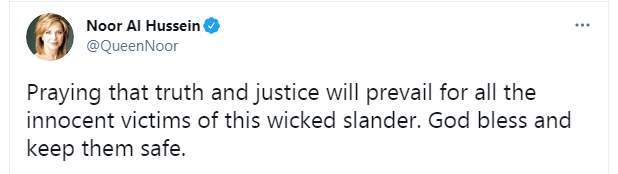 وكتبت الملكة نور الحسين تغريدة على تويتر "الدعاء لكي تسود الحقيقة والعدالة لجميع الضحايا الأبرياء لهذا الافتراء الشرير. بارك الله فيكم ويحفظهم"