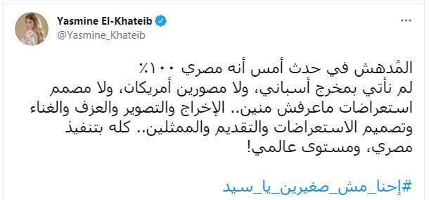 وكتبت الإعلامية ياسمين الخطيب "المُدهش في حدث أمس أنه مصري ١٠٠٪ لم نأتي بمخرج أسباني، ولا مصورين أمريكان، ولا مصمم استعراضات ماعرفش منين.