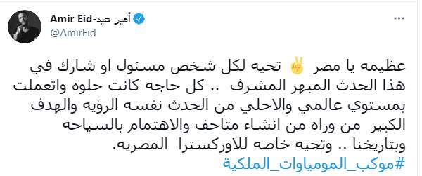 وكتب أمير عيد تغريدة على تويتر وقال: "عظيمه يا مصر تحيه لكل شخص مسئول او شارك في هذا الحدث المبهر المشرف.. كل حاجة كانت حلوة واتعملت بمستوي عالمي والأحلي من الحدث نفسه الرؤية والهدف الكبير من وراه من إنشاء متاحف والاهتمام بالسياحة وبتاريخنا.. وتحية خاصة للأوركسترا المصرية.