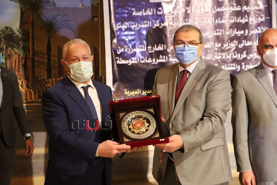 كما أهدى المحافظ درع المحافظة إلى وزير القوى العاملة تقديرًا له على جهده في الارتقاء بالعملية الإنتاجية من خلال توفير فرص عمل لذوي الهمم والعزيمة في إطار حياة كريمة، فضلا عن رعاية وحماية ومساعدة العمالة غير المنتظمة بتسليم بوالص تأمين علي الحياة لهم ضد الحوادث الشخصية حيث تغطي الوثيقة الوفاة والعجز الكلي أو الجزئي المستديم بما في ذلك نفقات العلاج الطبي.