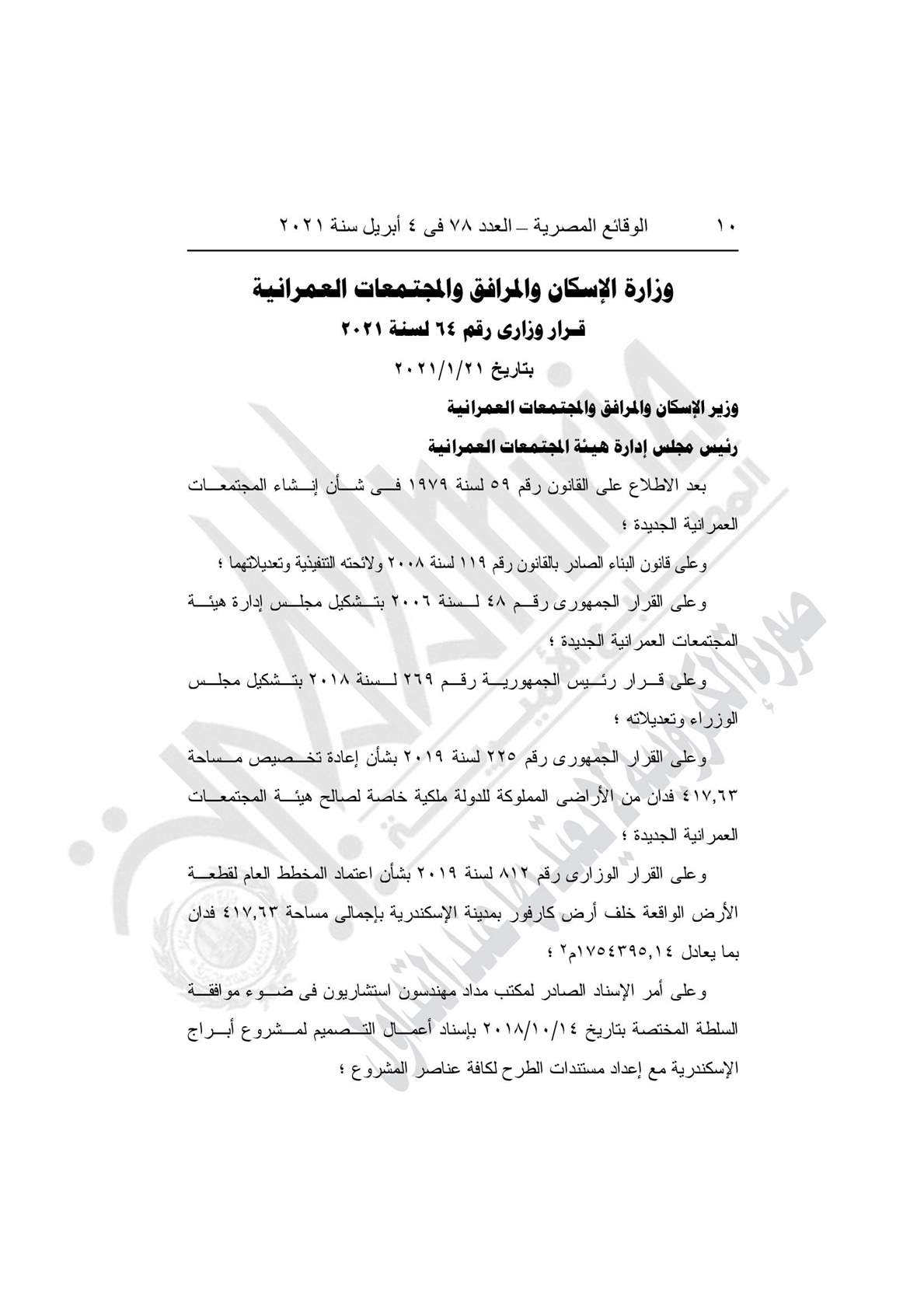 نشرت جريدة الوقائع المصرية في عددها رقم 78، الصادر في 4 إبريل 2021، قرار وزارة الإسكان والمرافق والمجتمعات العمرانية رقم 64 لسنة 2021، بشأن اعتماد تخطيط أرض بمساحة 56.91 فدان بقطعة الأرض خلف كارفور بمدينة الإسكندرية (صواري) بغرض إقامة مشروع عمراني متكامل (فيلات).