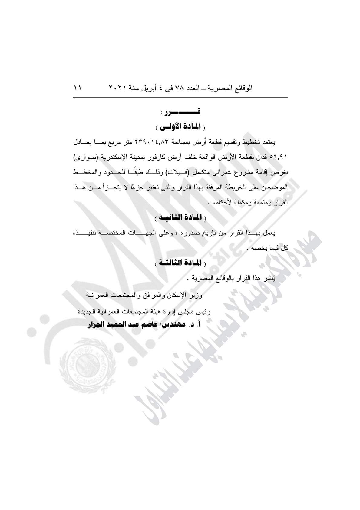 وينص القرار على اعتماد تخطيط قطعة أرض بمساحة 239014.83 متر مربع بما يعادل 56.91 فدان بقطعة الأرض الواقعة خلف أرض كارفور بمدينة الإسكندرية (صواري) بغرض إقامة مشروع عمراني متكامل (فيلات)، طبقًا للحدود والمخطط الموضحين على الخريطة المرفقة بالقرار، والتي تعتبر جزءًا لا يتخزأ من القرار ومكملة لأحكامه.