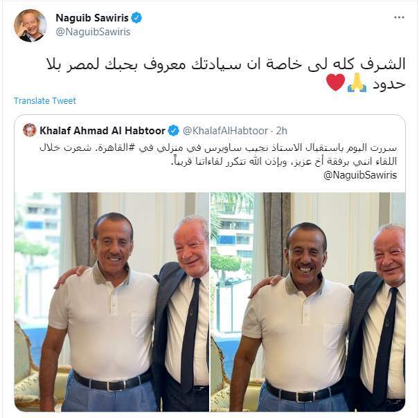 وجاء ذلك ردًا على تغريدة لخلف الحبتور قال فيها: «سررت اليوم باستقبال الأستاذ نجيب ساويرس في منزلي في #القاهرة. شعرت خلال اللقاء أنني برفقة أخ عزيز، وبإذن الله تتكرر لقاءاتنا قريباً».