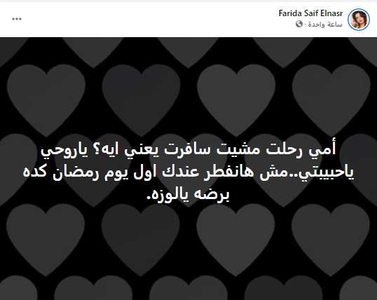 وكتبت "فريدة" عبر حسابها على موقع التواصل الإجتماعي "فيس بوك" :" أمي رحلت مشيت سافرت يعني ايه؟ ياروحي ياحبيبتي..مش هانفطر عندك اول يوم رمضان كده برضه يالوزه".