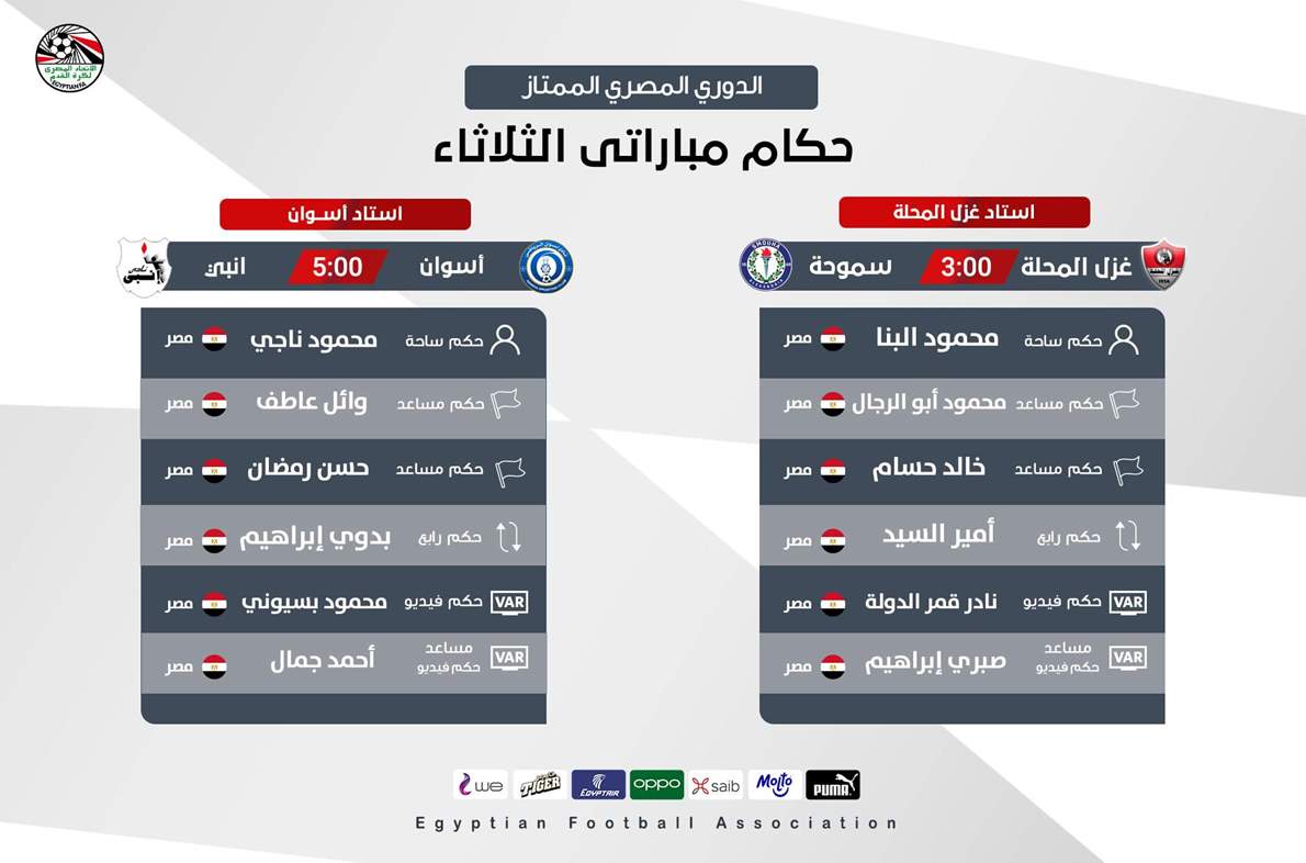 أعلنت لجنة الحكام الرئيسية بالاتحاد المصري لكرة القدم، أسماء حكام مباراتي اليوم الثلاثاء، ضمن مواجهات الجولة الثامنة عشرة من بطولة الدوري الممتاز، على النحو التالي: