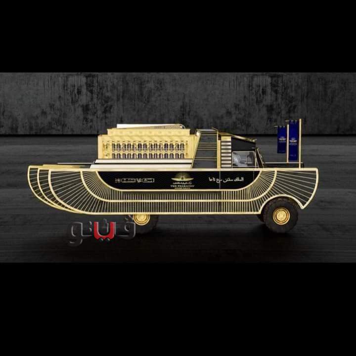 وعن تصميم ديكور العربة قال انه تمت إضافة هيكل حديدي على السيارة العادية ثم تغطيتها بهيكل خشبي، ثم تصميم الديكورات ورسم النقوش الفرعونية، والتي خضعت لمراجعة ودراسة وبحث لتحري الدقة بالتعاون مع وزارة السياحة والآثار.