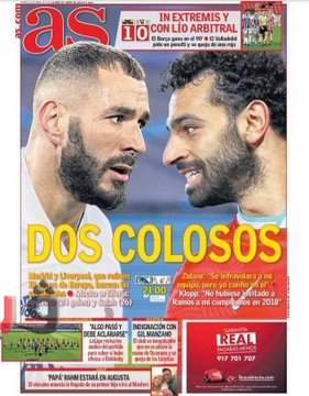 صحيفة "آس" الإسبانية وضعت صورة الثنائي محمد صلاح وكريم بنزيمة وعنونت غلافها قبل مواجهة ريال مدريد وليفربول هذا المساء "عملاقان".