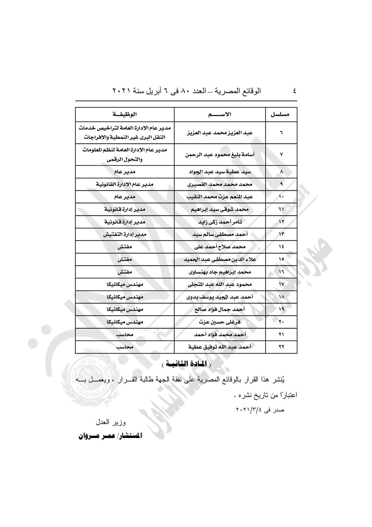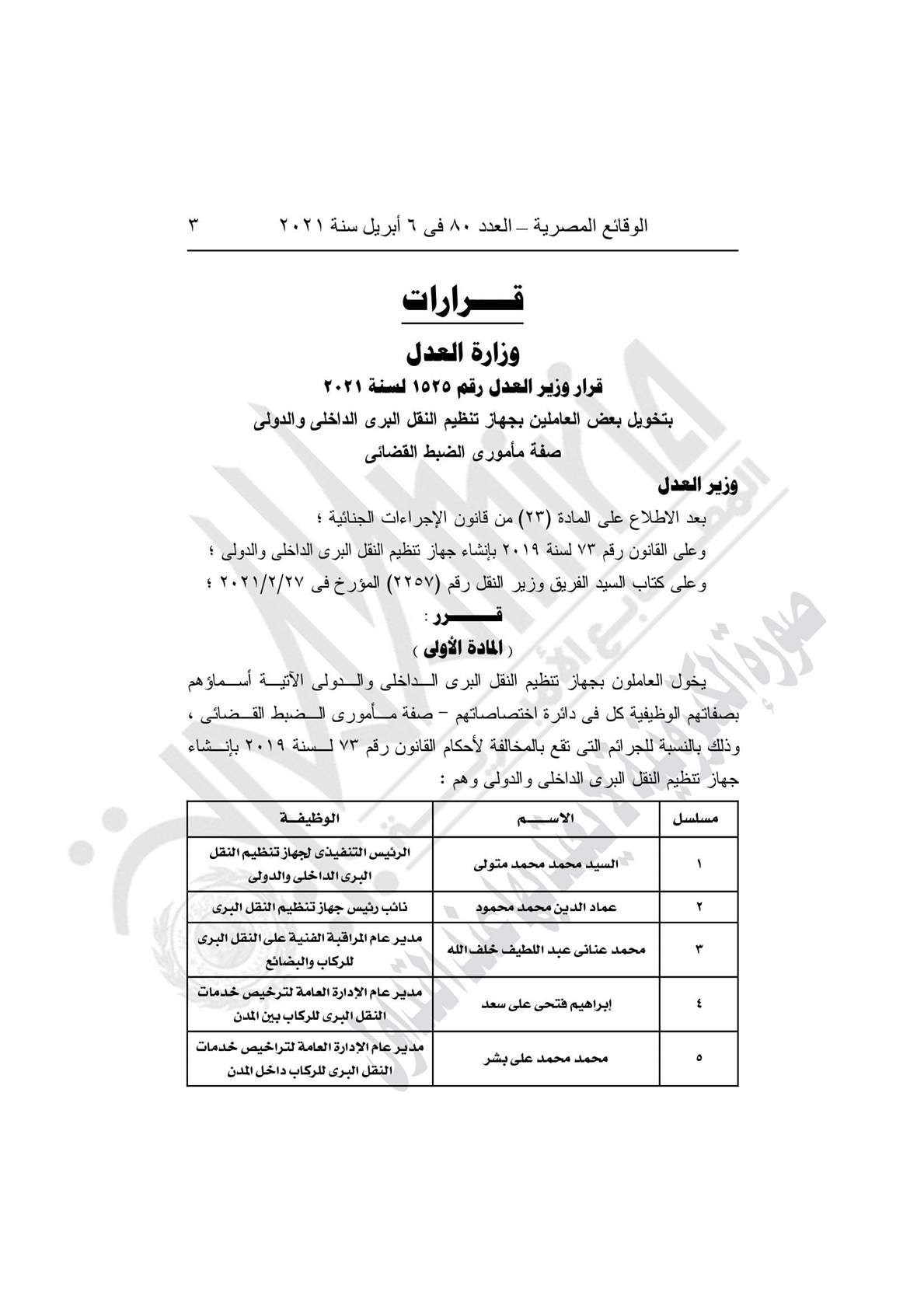 نشرت جريدة الوقائع المصرية في العدد 80، الصادر في 6 إبريل 2021، قرار وزير العدل المستشار عمر مروان رقم 1525 لسنة 2021، بتخويل بعض العاملين بجهاز تنظيم النقل البري الداخلي والدولي صفة مأموري الضبط القضائي.