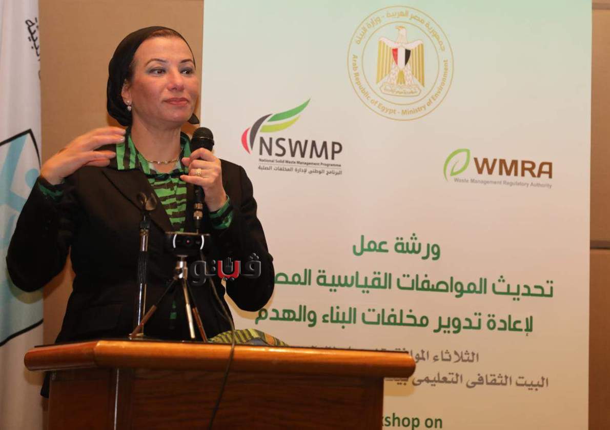 جاء ذلك خلال كلمتها بورشة العمل حول "تحديث المواصفات القياسية المصرية لإعادة تدوير مخلفات الهدم والبناء والتى أطلقتها وزارة البيئة من خلال البرنامج الوطنى لإدارة المخلفات الصلبة التابع للوزارة ، وذلك بالمركز الثقافى التعليمى بيت القاهرة بالفسطاط" بمشاركة ممثلى برنامج المعونة الألمانية GIz) ) وممثلى الوزارات والجهات المعنية من الإستثمار والاسكان والتعاون الدولى ،المالية ،التنمية المحلية ،النقل، التجارة والصناعة الإنتاج الحربى. والمركز القومى لبحوث مواد البناء والإسكان ، والهيئة المصرية للمواصفات والجودة.