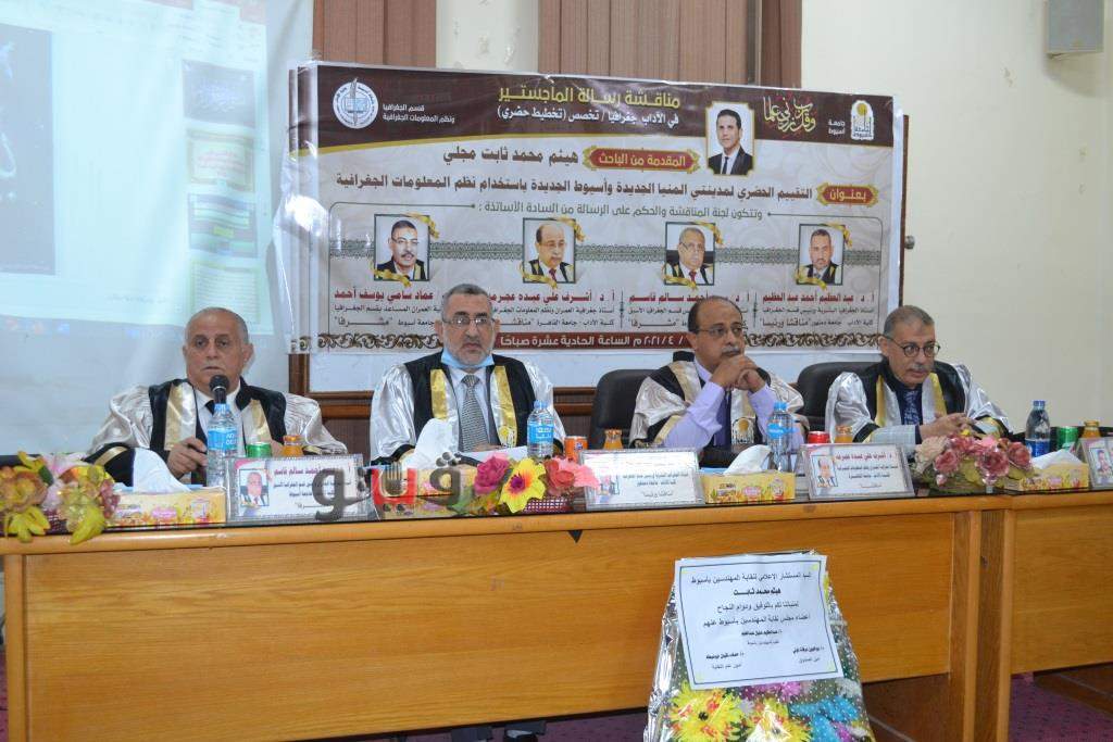 وضمت لجنة الإشراف والحكم على الرسالة المُقدمة من الباحث هيثم محمد ثابت، المستشار الإعلامي والثقافي لنقابة المهندسين بأسيوط، والتي جاءت بعنوان "التقييم الحضري لمدينتي المنيا الجديدة وأسيوط الجديدة باستخدام نظم المعلومات الجغرافية"، الدكتور عبد العظيم أحمد عبد العظيم، أستاذ ورئيس قسم الجغرافيا بكلية الآداب جامعة دمنهور، ووكيل الكلية لشئون خدمة المجتمع وتنمية البيئة سابقًا "مناقشًا ورئيسًا"، والدكتور سيد أحمد سالم قاسم أستاذ العمران ورئيس قسم الجغرافيا الأسبق بالجامعة "مشرفًا"، والدكتور أشرف علي عبده، أستاذ جغرافية العمران ونظم المعلومات الجغرافية بجامعة القاهرة "مناقشًا"، والدكتور عماد سامي يوسف، أستاذ العمران المساعد بجامعة أسيوط "مشرفًا".