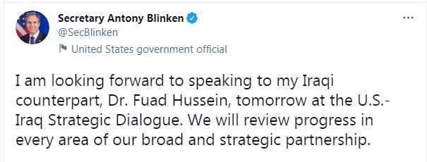 وكتب أنتوني بلينكين تغريدة على تويتر "أتطلع إلى التحدث إلى نظيري العراقي ، الدكتور فؤاد حسين، غدًا في الحوار الاستراتيجي بين الولايات المتحدة والعراق، سنراجع التقدم المحرز في كل مجال من مجالات شراكتنا الواسعة والاستراتيجية".