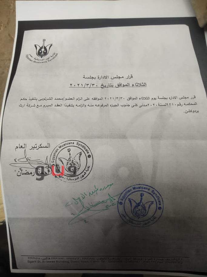 قرر مجلس نقابة المهن الموسيقية في اجتماعه الأخير الموافقة علي إلزام العضو محمد الشرنوبي بتنفيذ حكم المحكمة رقم ٢٢١٠ لسنة ٢٠٢٠ مدني كلي جنوب الجيزة المرفوعة منه وإلزامه بتنفيذ العقد المبرم بينه وبين شركة إيرث برودكشن.