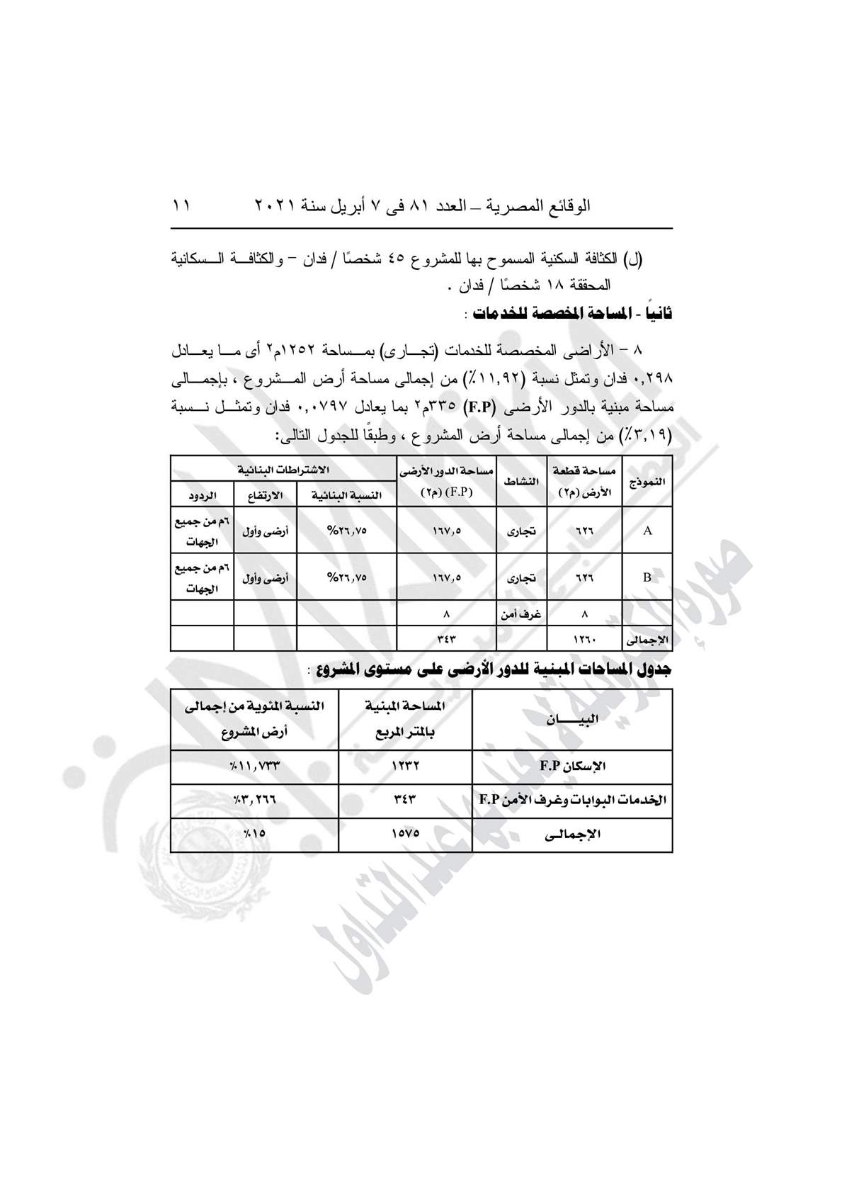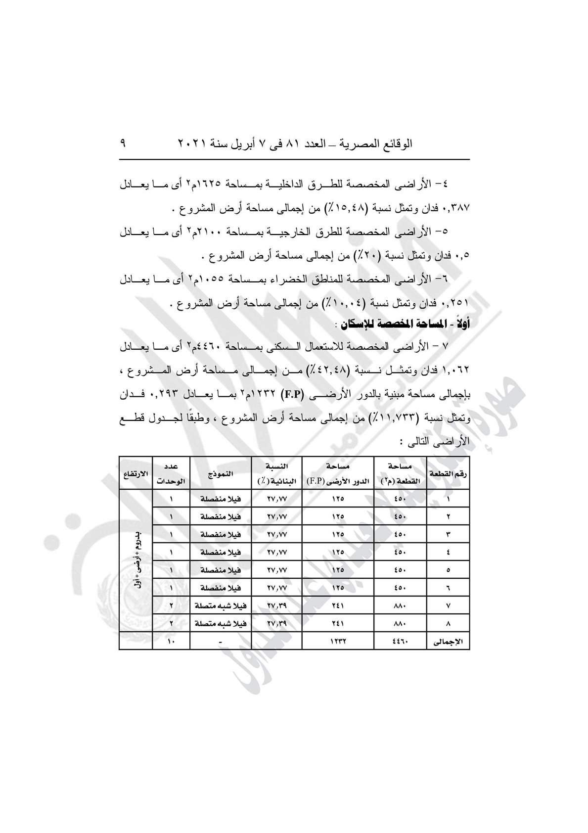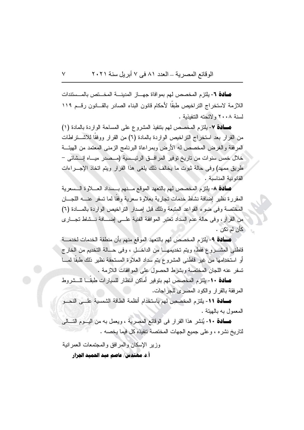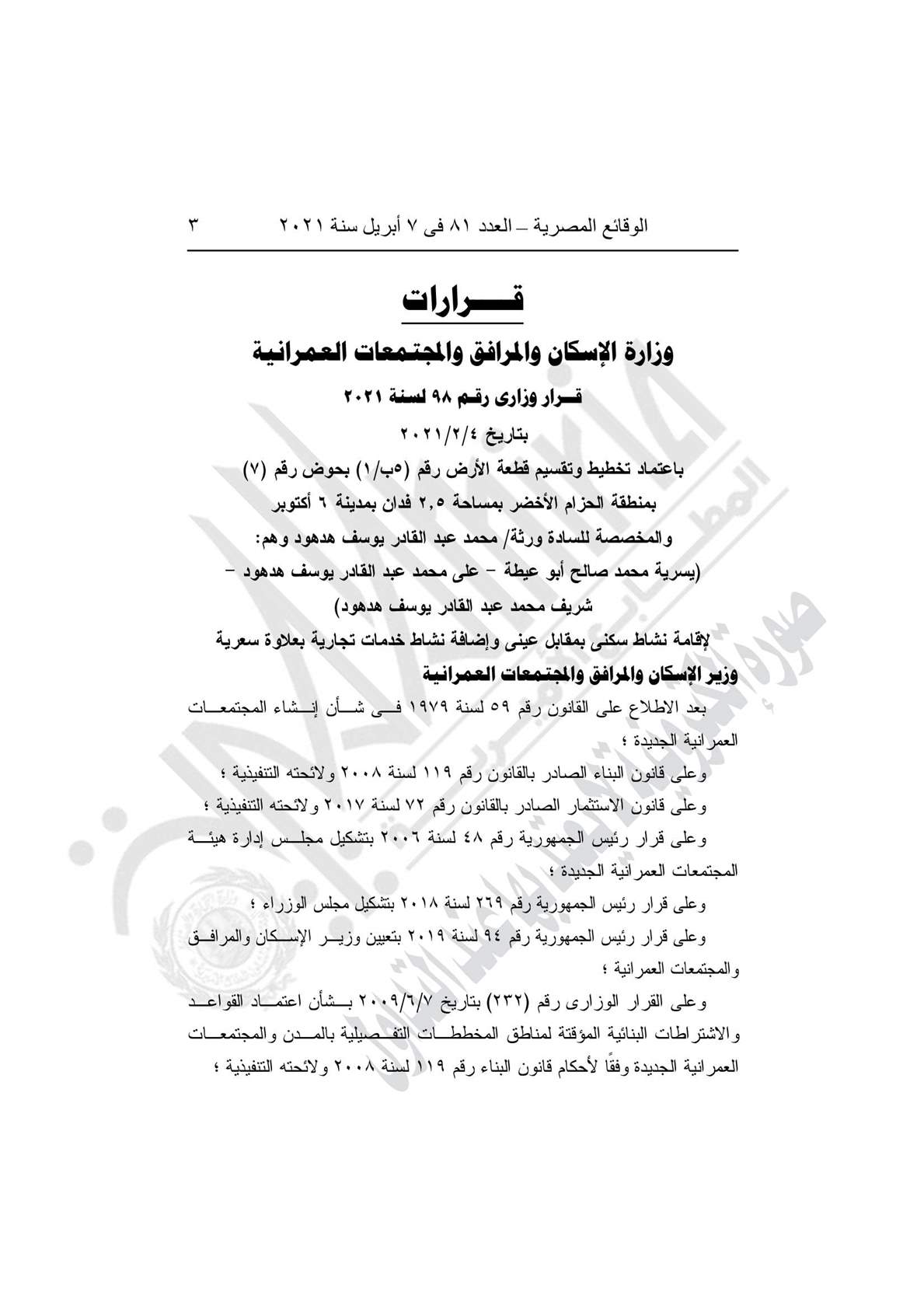نشرت جريدة الوقائع المصرية في عددها رقم 81، الصادر في 7 أبريل 2021، قرار وزارة الإسكان والمرافق والمجتمعات العمرانية رقم 98 لسنة 2021، باعتماد تخطيط وتقسيم قطعة الأرض رقم (5ب/1) بحوض رقم (7) بمنطقة الحزام الأخضر بمساحة 2.5 فدان بمدينة 6 أكتوبر، لإقامة نشاط سكني بمقابل عيني، وإضافة نشاط خدمات تجارية بعلاوة سعرية.