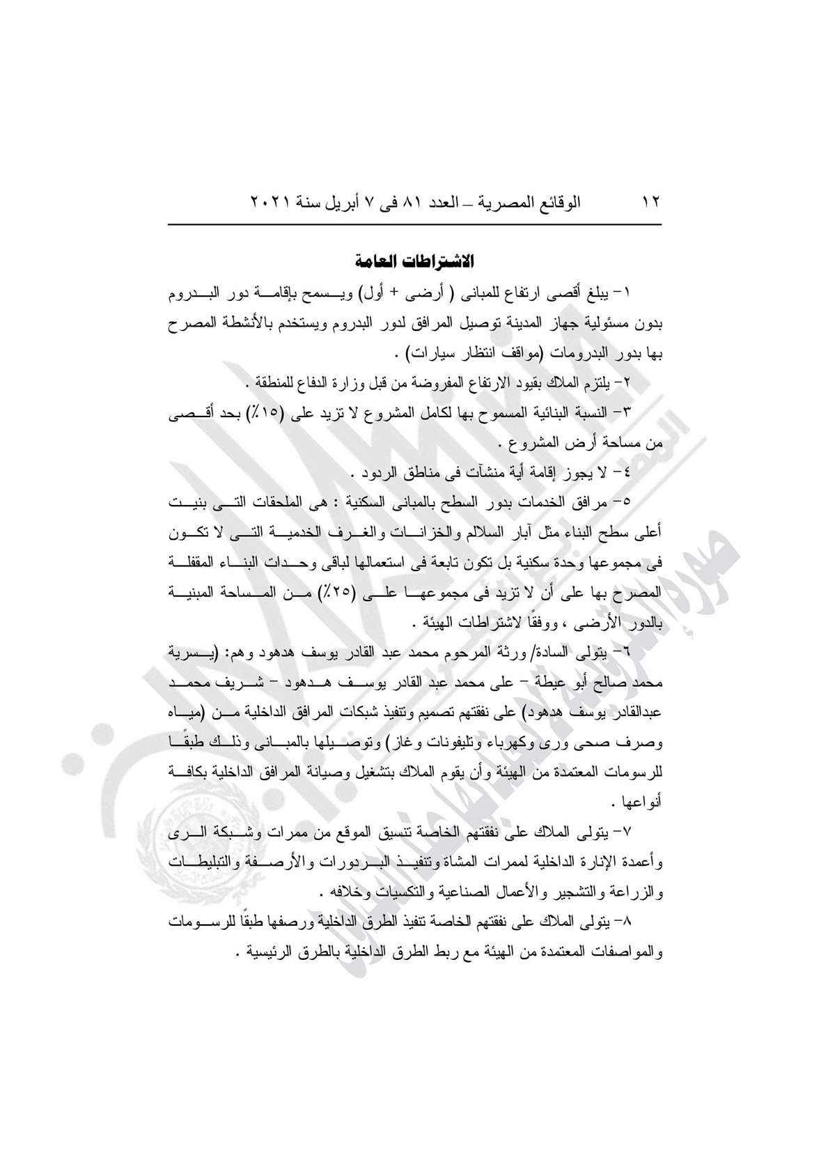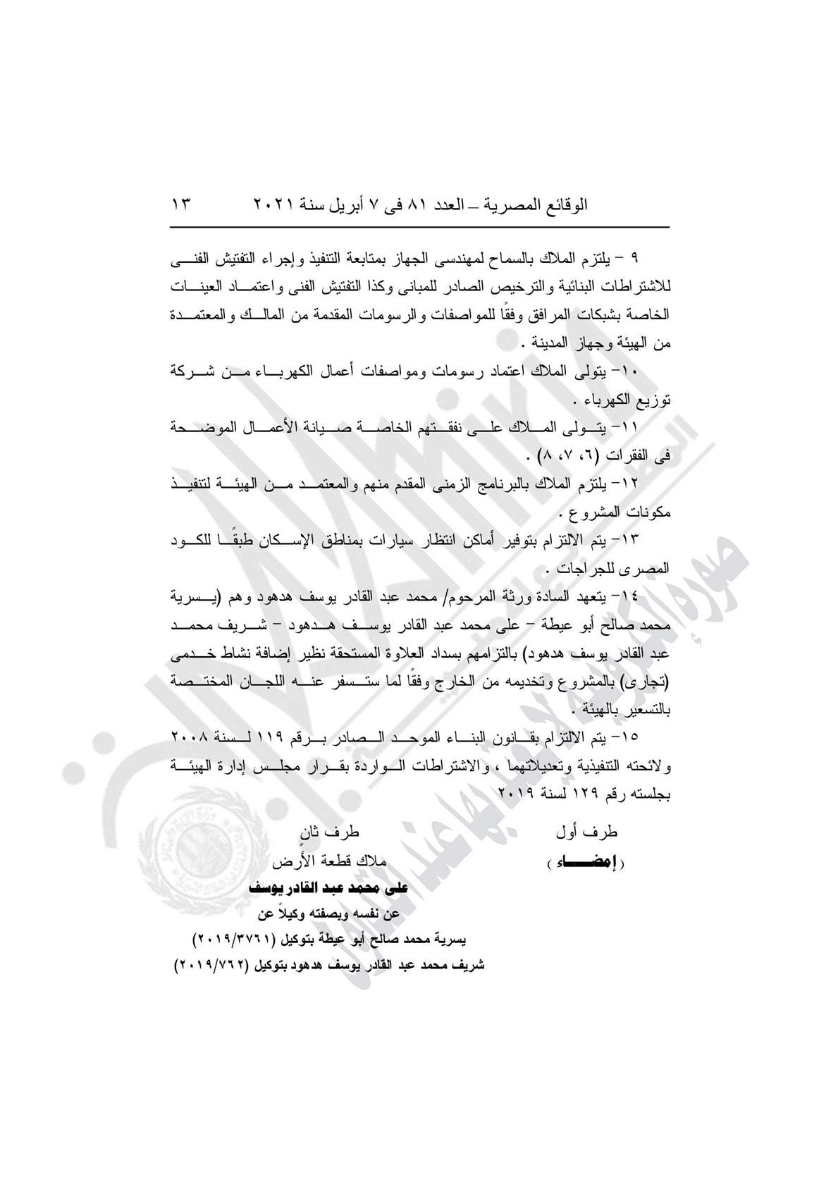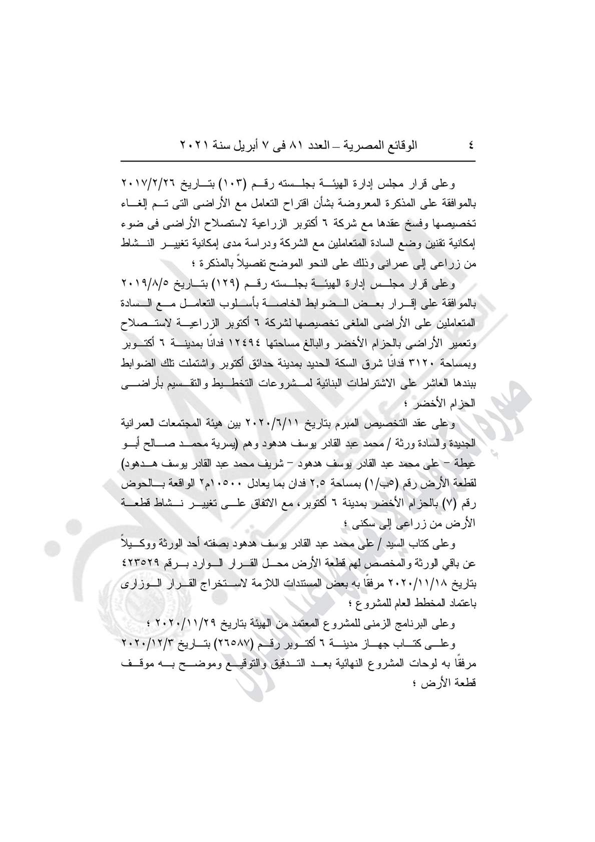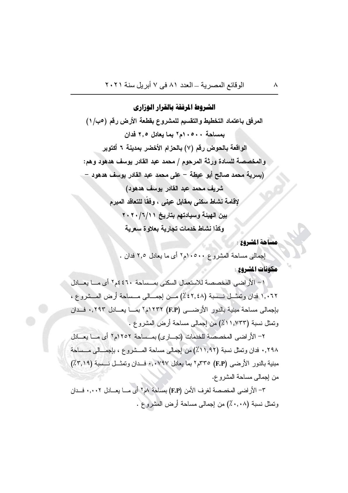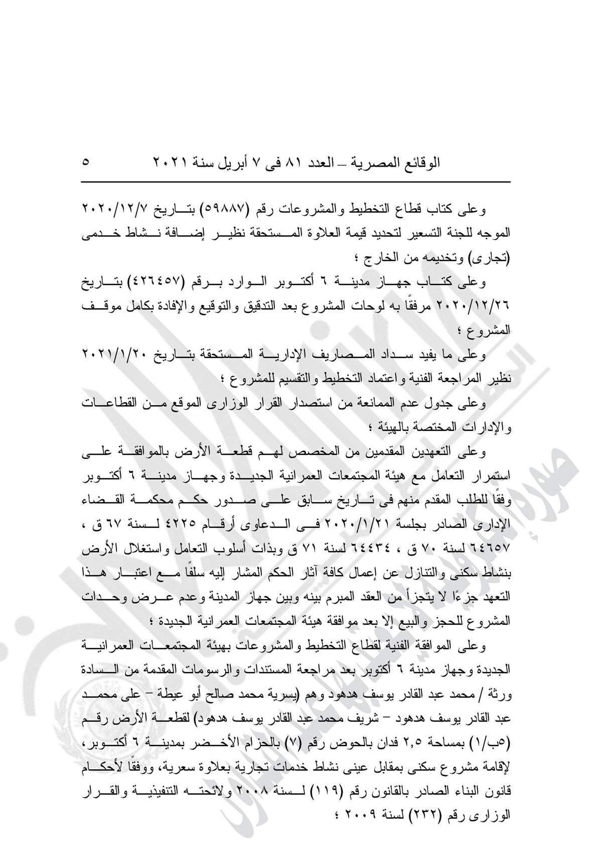 وينص القرار في مادته الأولى على اعتماد تخطيط وتقسيم قطعة الأرض رقم (5ب/1) بمساحة 2.5 فدان بما يعادل 10500 متر مربع، الواقعة بالحوض رقم 7 بمنطقة الحزام الأخضر بمدينة 6 أكتوبر والمخصصة لورثة (محمد عبد القادر، يوسف هدهود، لإقامة مشروع سكني بمقابل عيني وإضافة نشاط سكني بمقابل عيني، وإضافة نشاط خدمات تجارية بعلاوة تجارية بعلاوة سعرية.