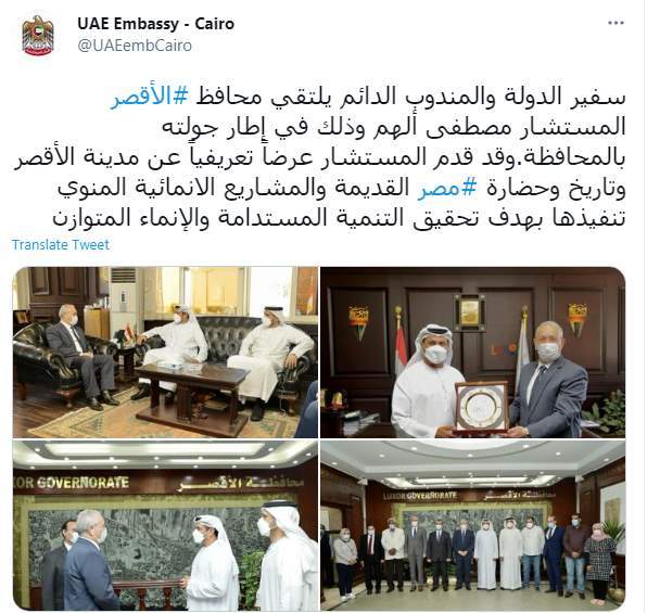 وكتبت سفارة الإمارات تغريدة على تويتر "سفير الدولة والمندوب الدائم يلتقي محافظ الأقصر المستشار مصطفى ألهم وذلك في إطار جولته بالمحافظة.