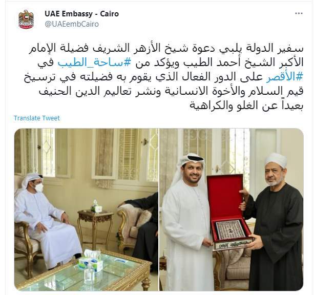 وأضافت السفارة "سفير الدولة يلبي دعوة شيخ الأزهر الشريف فضيلة الإمام الأكبر الشيخ أحمد الطيب ويؤكد من ساحة الطيب في الأقصر على الدور الفعال الذي يقوم به فضيلته في ترسيخ قيم السلام والأخوة الانسانية ونشر تعاليم الدين الحنيف بعيداً عن الغلو والكراهية"