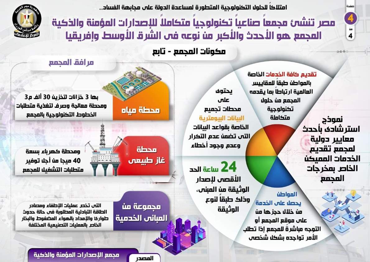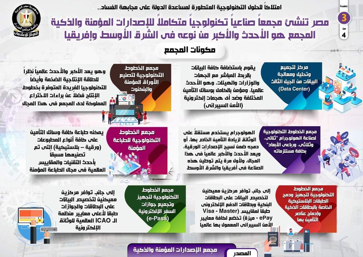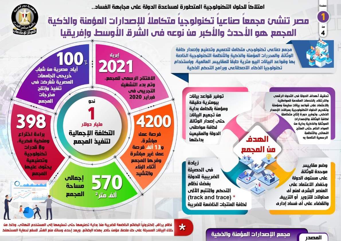 وفي هذا الصدد، نشر المركز الإعلامي لمجلس الوزراء، تقريراً تضمن إنفوجرافات تسلط الضوء على إنشاء مصر أكبر وأحدث مجمع صناعي تكنولوجي متكامل للإصدارات المؤمنة والذكية في الشرق الأوسط وأفريقيا.