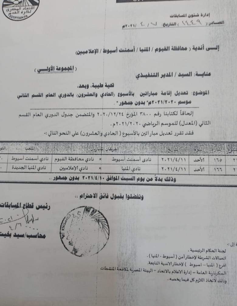 قررت لجنة مسابقات دوري القسم الثاني، تعديل موعد مباراتين في مجموعة الصعيد لتقام يوم الأحد المقبل بدلا من السبت وهما مباراتي أسمنت أسيوط مع الفيوم، والمنيا مع الإعلاميين.