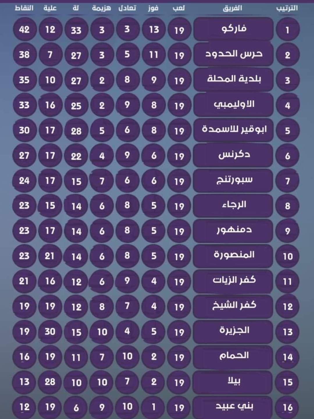 ويتصدر فاركو قمة المجموعة برصيد 42 نقطة ويليه حرس الحدود ثانيا برصيد 38 نقطة ثم بلدية المحلة ثالثا برصيد 35 نقطة.