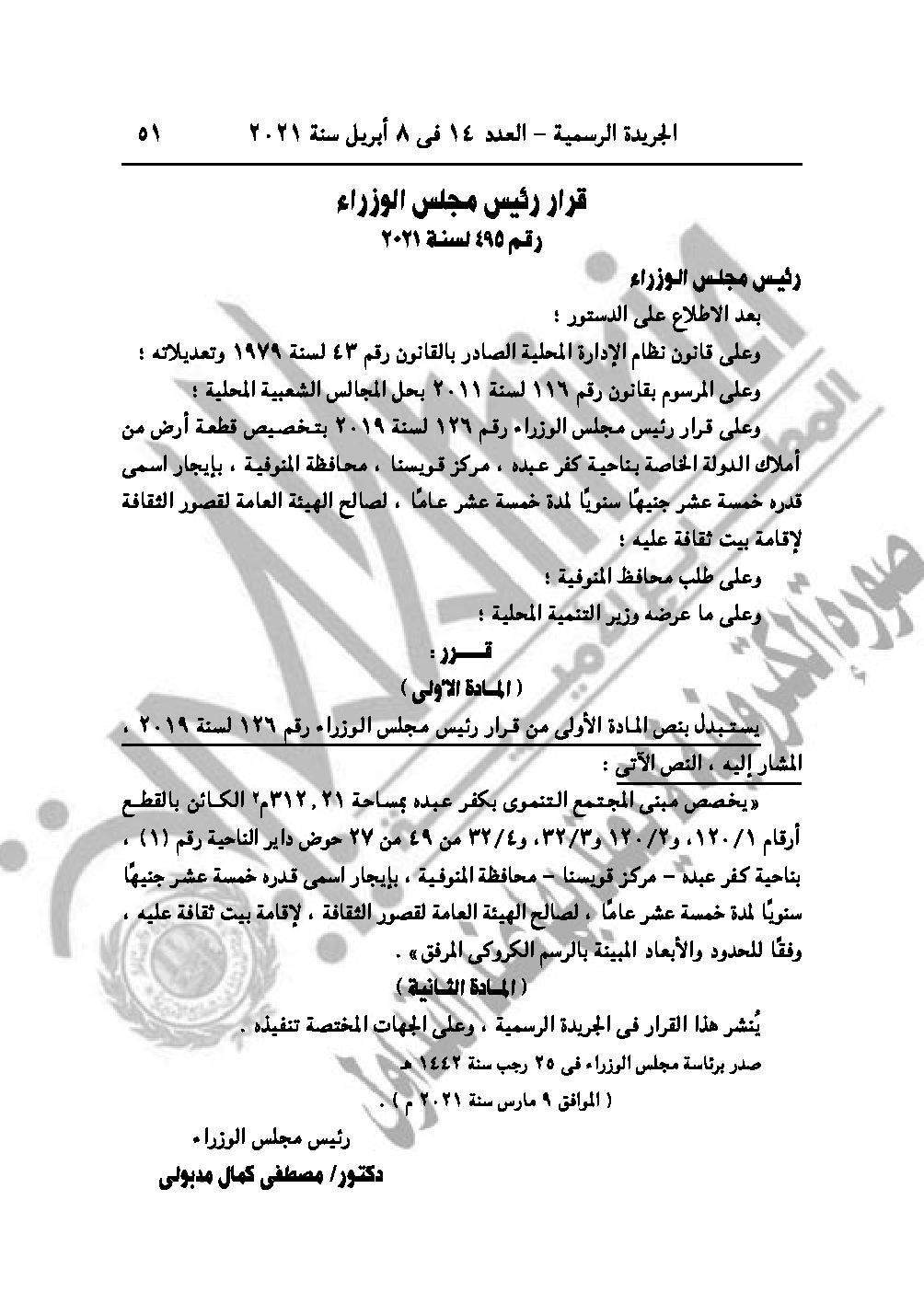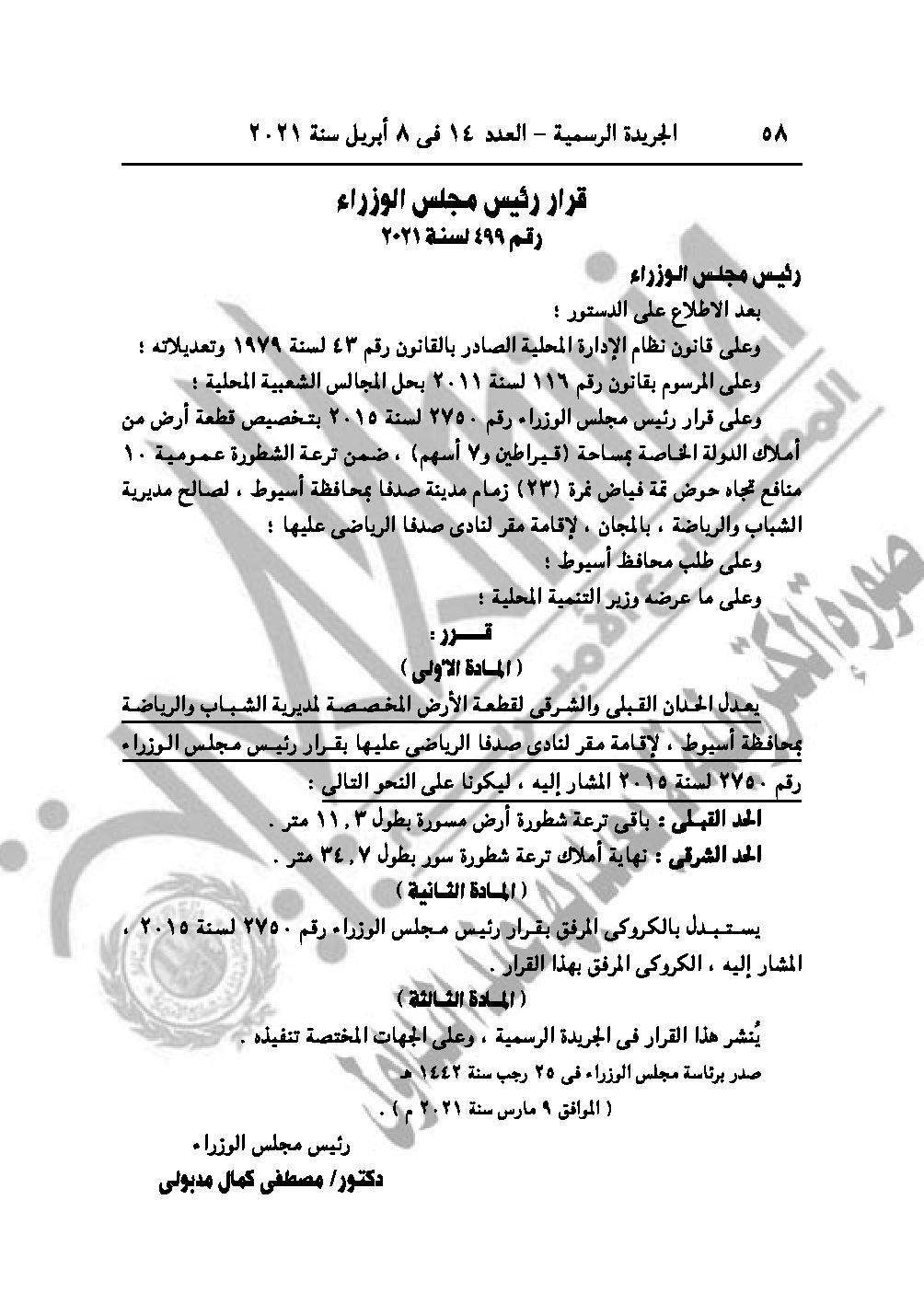 والقرار رقم 499 لسنة 2021، بتعديل الحدين القبلي والشرقي لقطعة الأرض المخصصة لمديرية الشباب والرياضة بمحافظة أسيوط، لإقامة مقر لنادي صدفا الرياضي عليها، بقرار رئيس مجلس الوزراء رقم 2750 لسنة 2015.