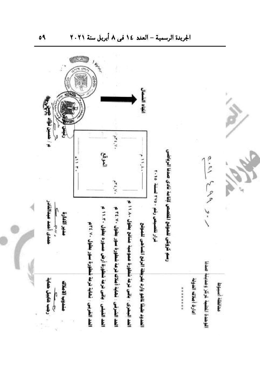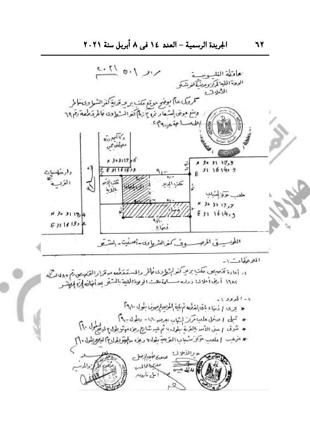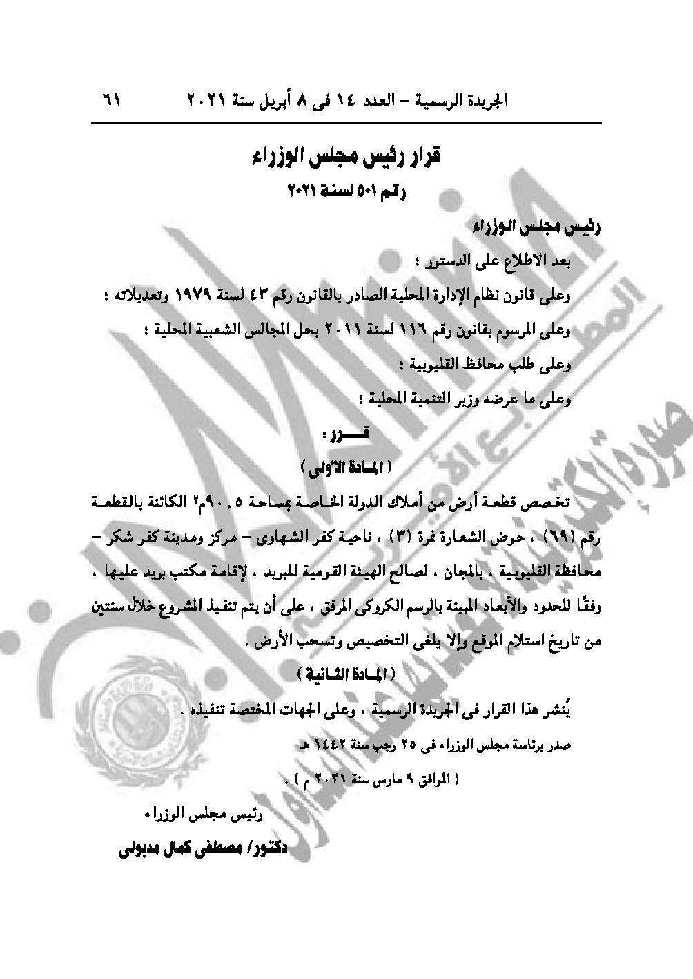 والقرار رقم 501 لسنة 2021 بتخصيص قطعة أرض من أملاك الدولة الخاصة، حوض الشعار نمرة (3)، ناحية كفر الشهاوي مركز ومدينة كفر شكر، محافظة القليوبية، بالمجان، لإقامة مكتب بريد عليها.