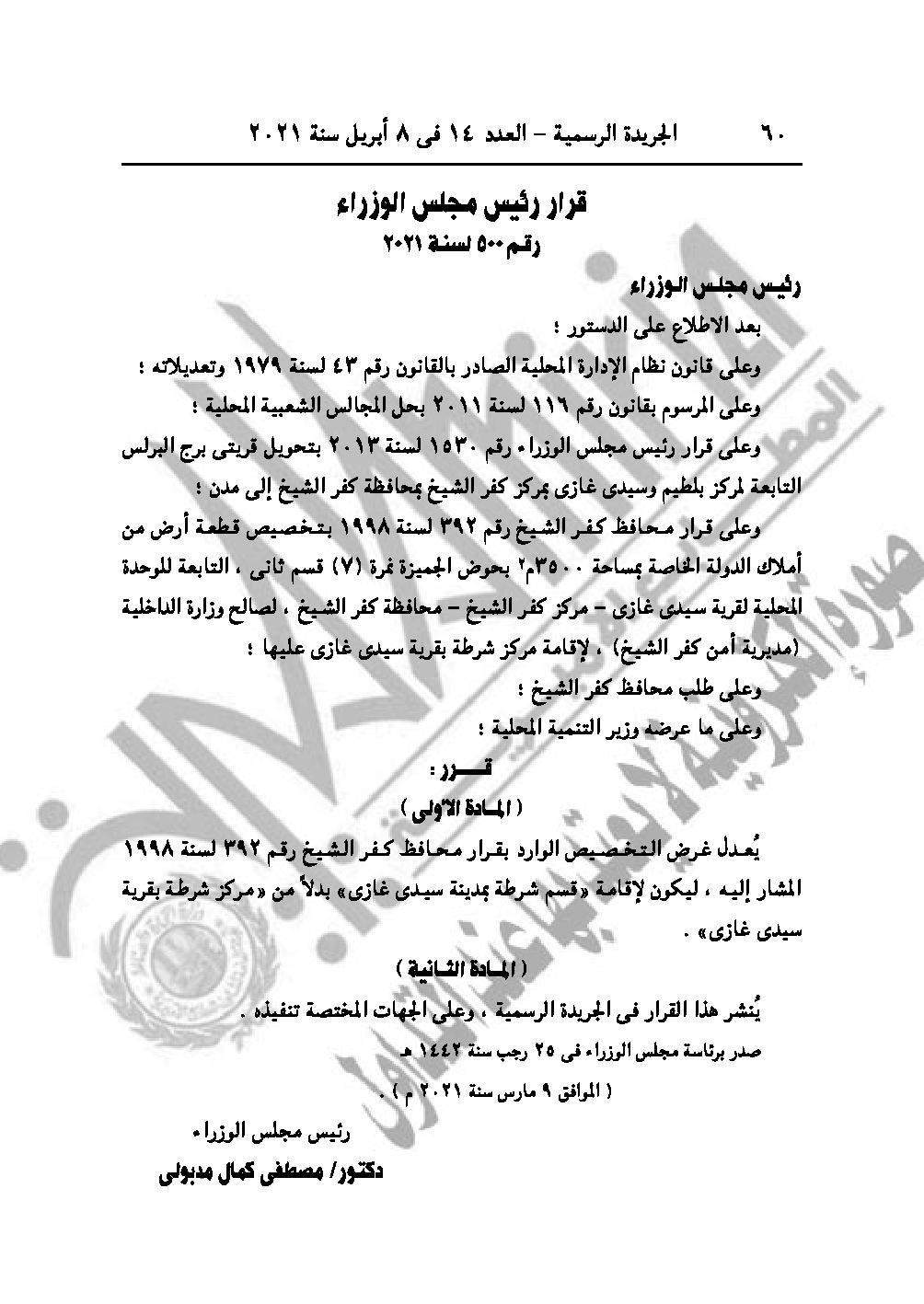 والقرار رقم 500 لسنة 2021، بتعديل غرض التخصيص الوارد بقرار محافظ كفر الشيخ رقم 329 لسنة 1998، ليكون لإقامة "قسم شرطة بمدينة سيدي غازي" بدلًا من "مركز شرطة بقرية سيدي غازي.