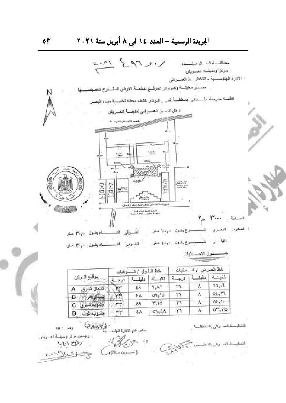 والقرار رقم 496 لسنة 2021، بتخصيص قطعة أرض من أملاك الدولة الخاصة بمنطقة شرق الوادي خلف محطة تحلية مياة البحر، بمدينة العريش بمحافظة شمال سيناء، بالمجان، لإقامة مدرسة تعليم أساسي عليها.