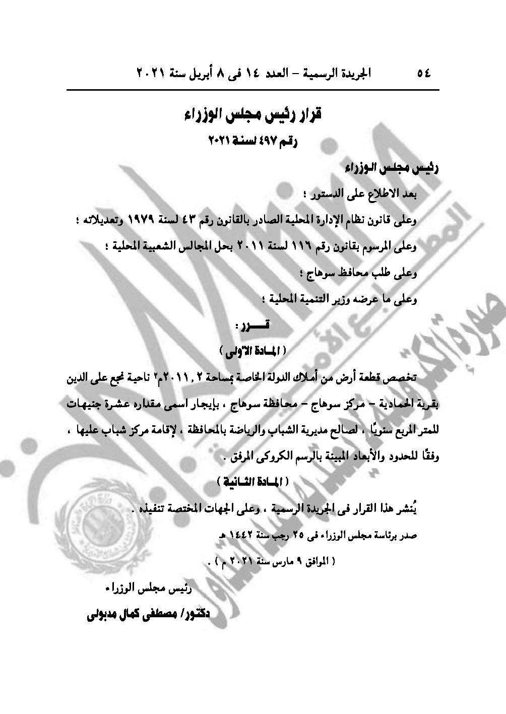 والقرار رقم 497 لسنة 2021، بتخصيص قطعة أرض من أملاك الدولة الخاصة بناحية نجع على الدين بقرية الحمادية، مركز سوهاج بمحافظة سوهاج لإقامة مركز شباب عليها.