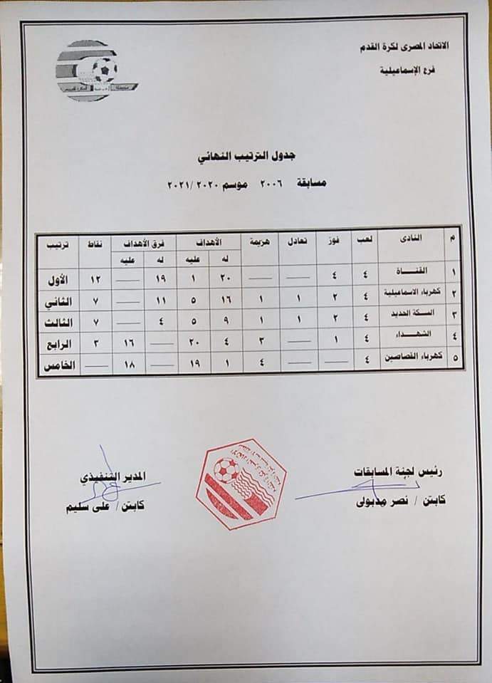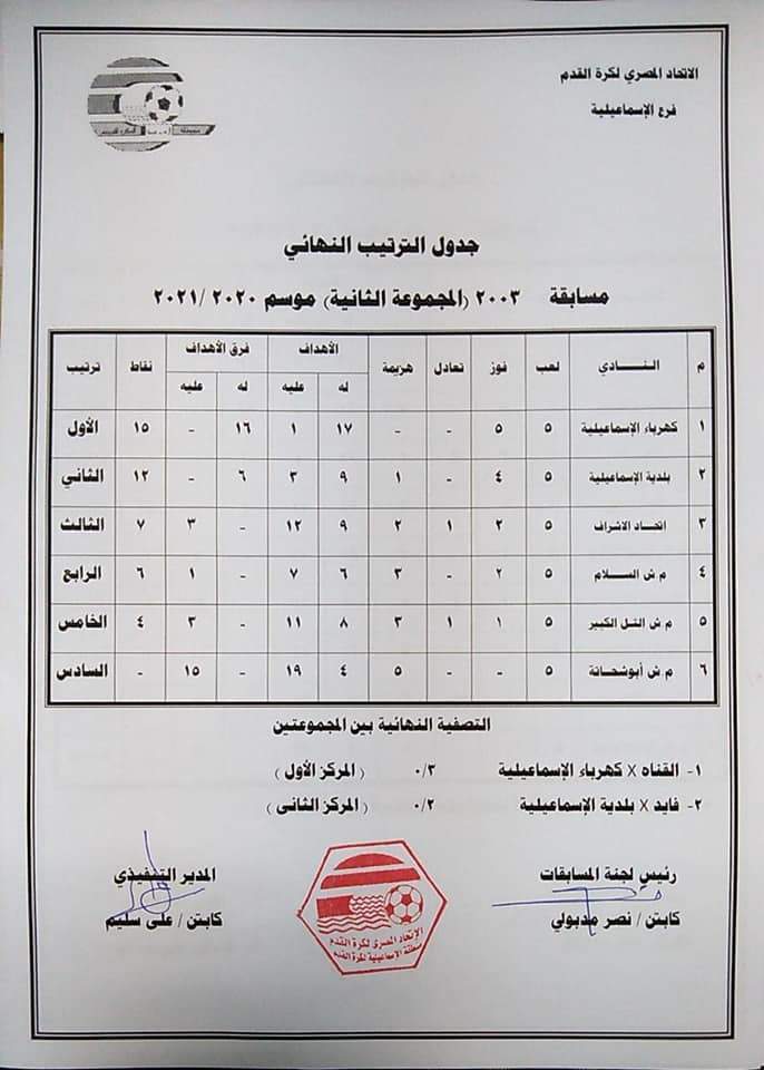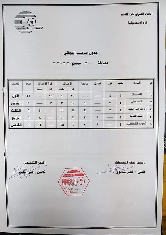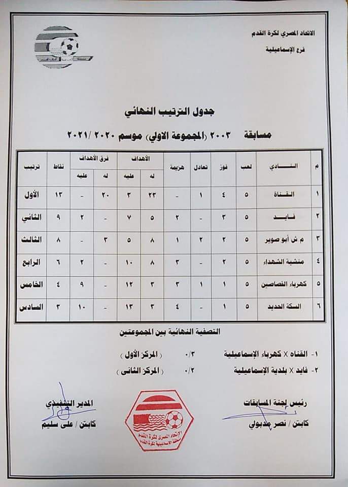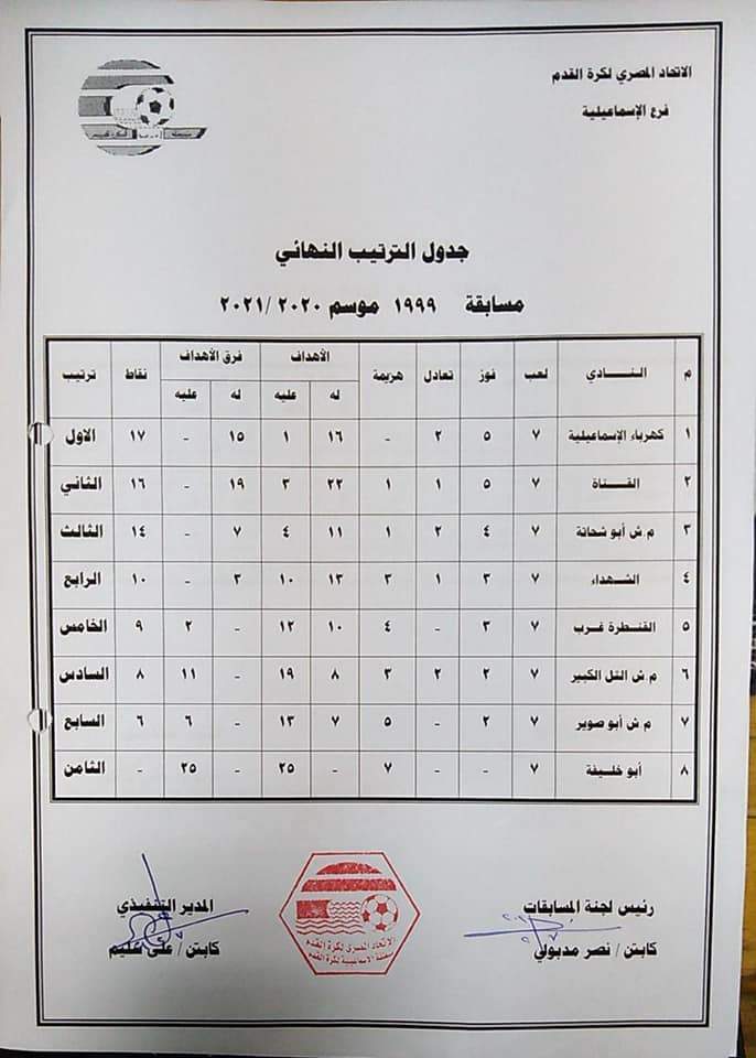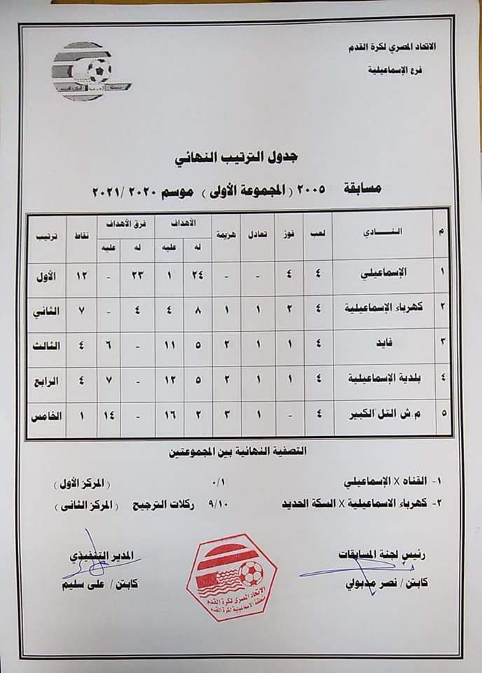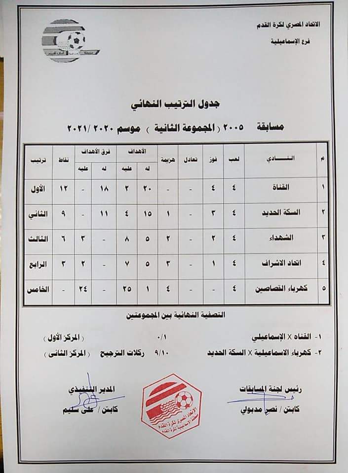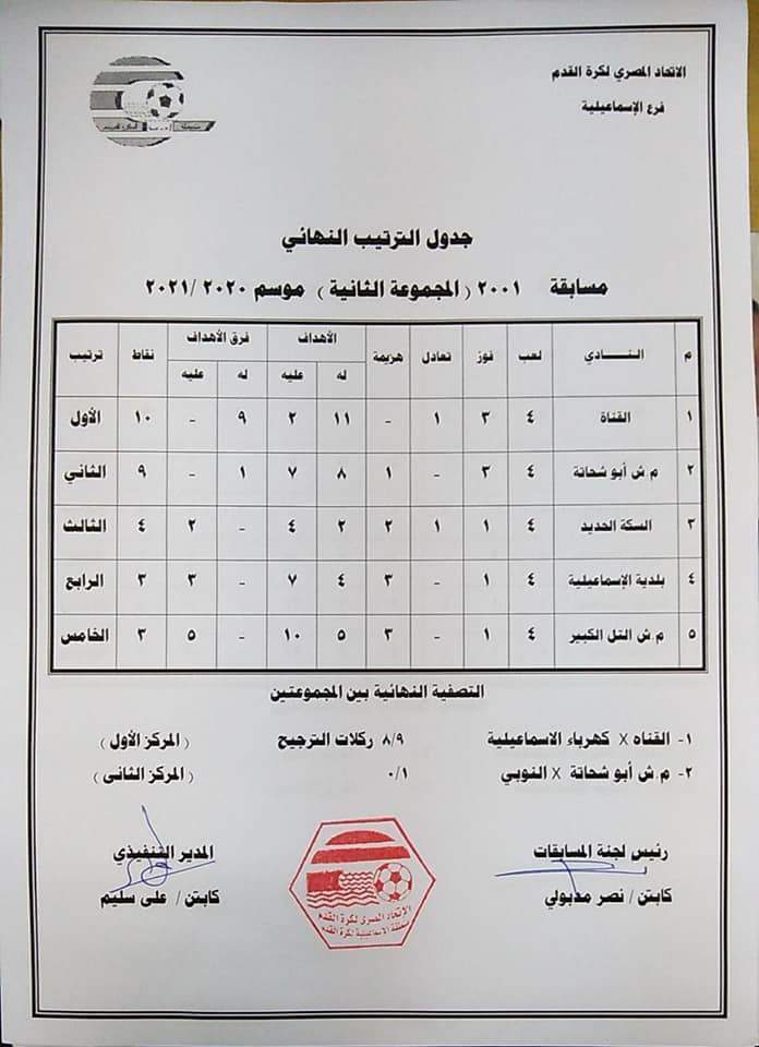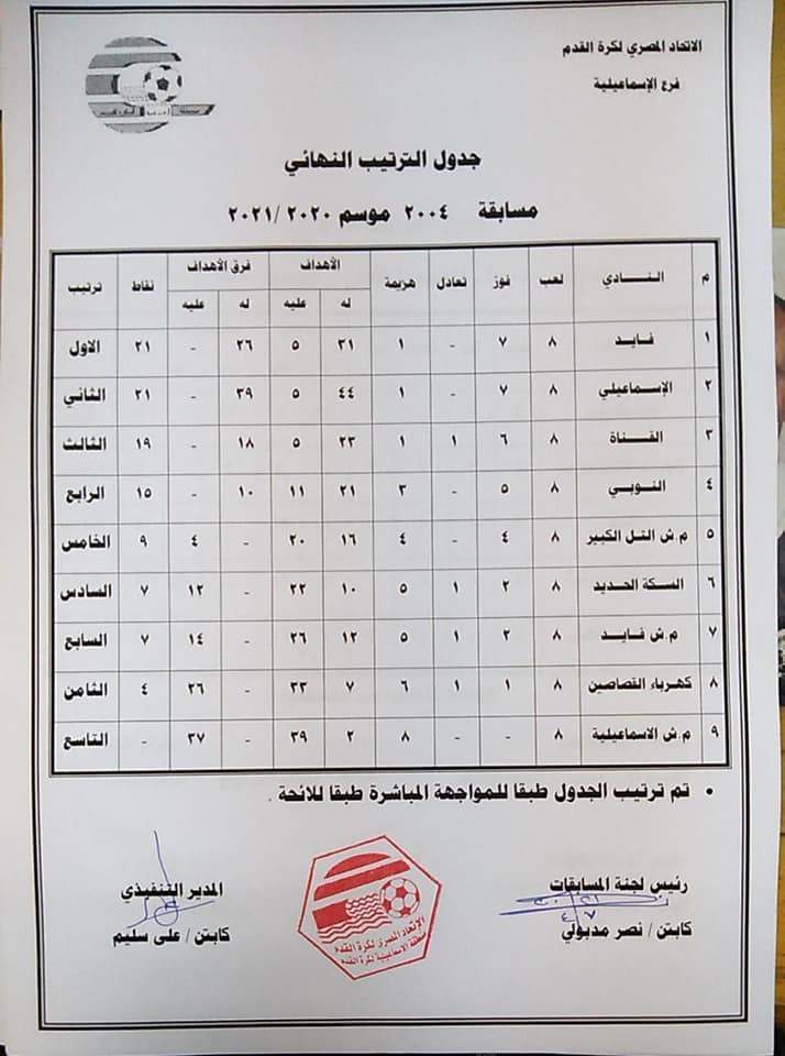 اعتمدت منطقة الإسماعيلية لكرة القدم، جداول الترتيب النهائي لمسابقة الناشئين موسم 2020-2021 بعد الانتهاء من المنافسات من مواليد 2006 إلي مواليد 1999.