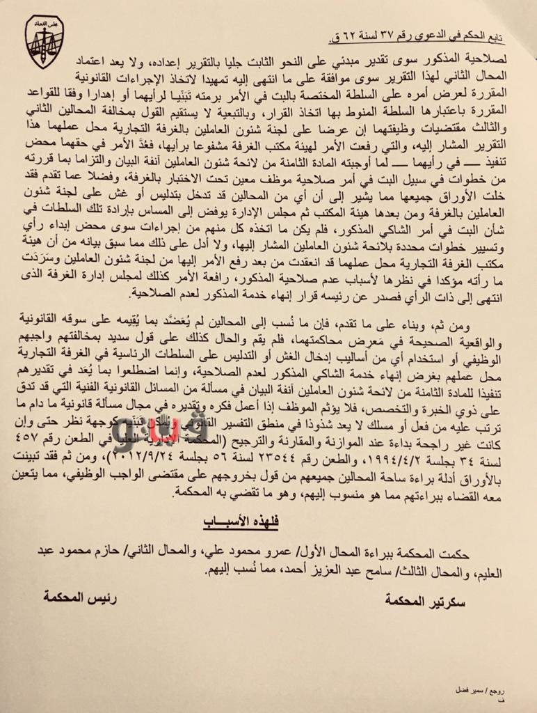 حكم البراءة شمل كلًا من عمرو محمود علي، رئيس قسم الشهادات بالغرفة التجارية بالفيوم وحازم محمود عبد العليم، مدير عام الغرفة التجارية بالفيوم وسامح عبد العزيز أحمد، مدير إدارة شئون العاملين