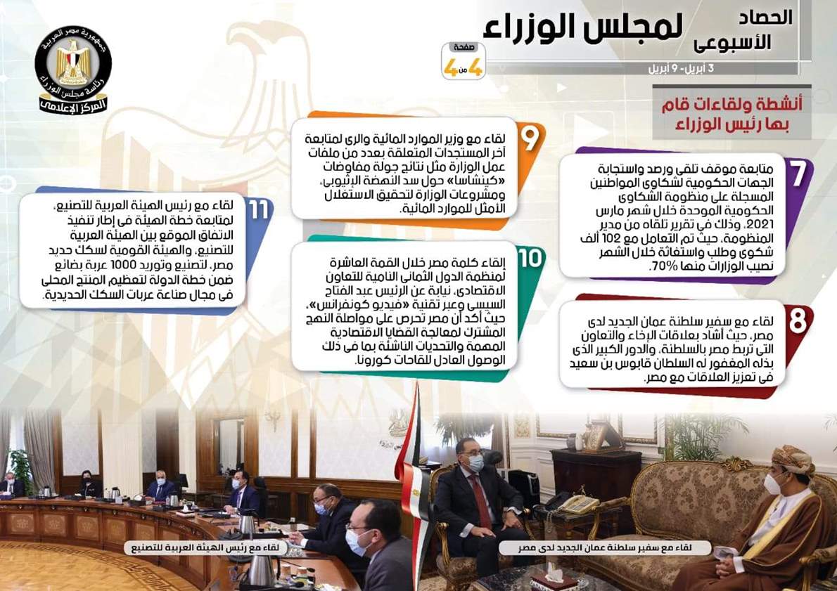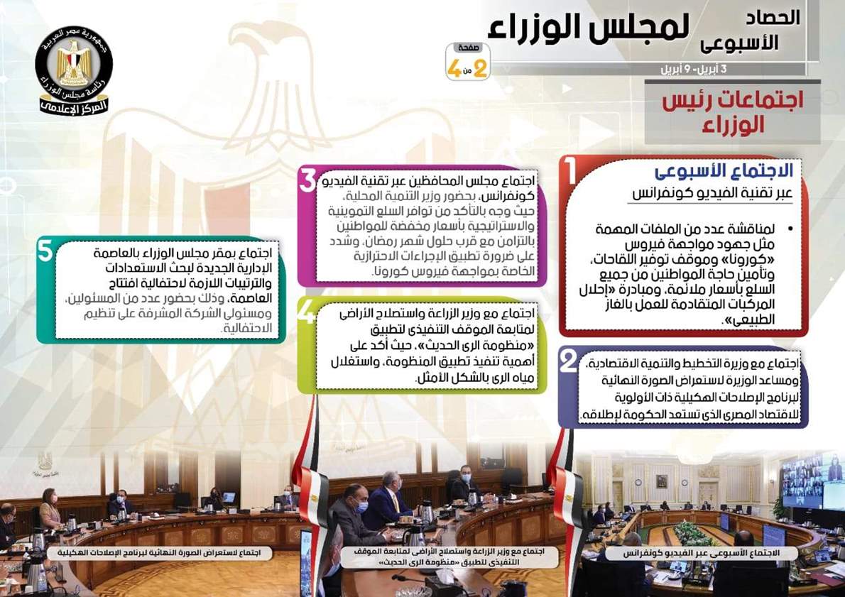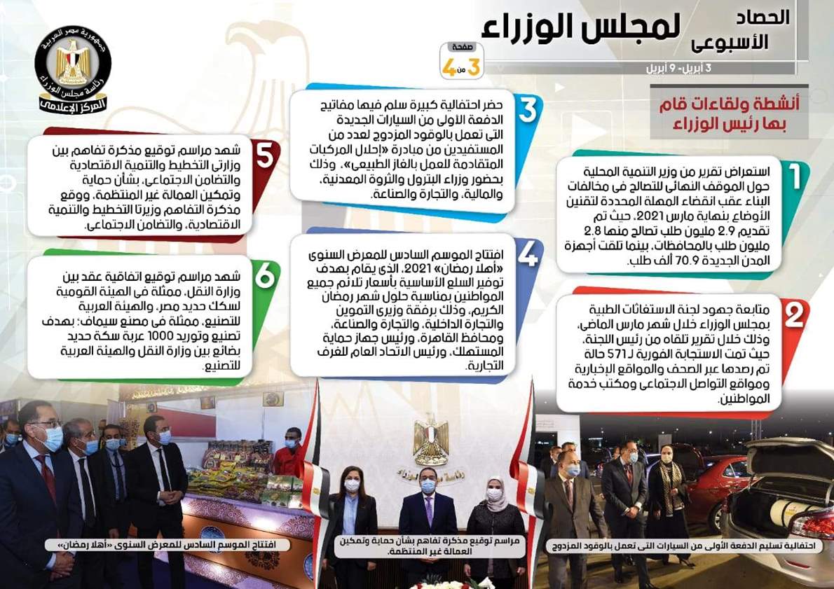 نشر المركز الإعلامي لمجلس الوزراء، تقريراً شمل إنفوجرافات سلط من خلالها الضوء على الحصاد الأسبوعي لمجلس الوزراء، وذلك خلال الفترة من 3حتى 9 أبريل 2021، والذي تضمن الموافقة على عدد من القرارات، فضلاً عن الاجتماعات واللقاءات التي عقدها الدكتور مصطفى مدبولي، رئيس مجلس الوزراء، بالإضافة إلى ما قام به من أنشطة.