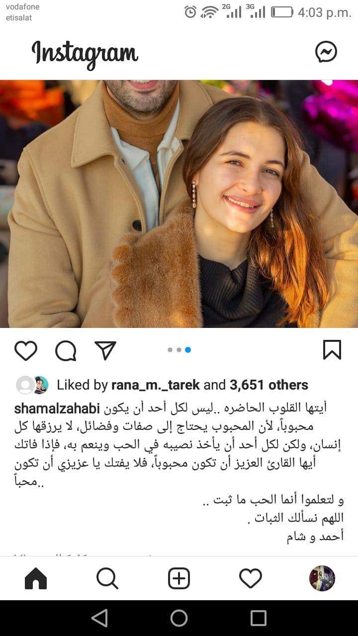 وكتبت شام :" أيتها القلوب الحاضرة.. ليس لكل أحد أن يكون محبوباً، لأن المحبوب يحتاج إلى صفات وفضائل لا يرزقها كل إنسان، ولكن لكل أحد أن يأخذ نصيبه في الحب وينعم به، فإذا فاتك أيها القارئ العزيز أن تكون محبوباً، فلا يفتك يا عزيزي أن تكون محباً، ولتعلموا إنما الحب ما ثبت، اللهم نسألك الثبات أحمد وشام".