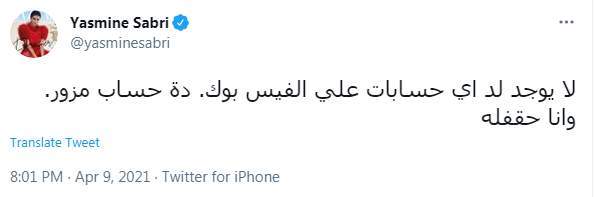 وكتبت ياسمين صبري قائلة: "لا يوجد لدى حسابات على فيس بوك، ده حساب مزور، وأنا هقفله".
