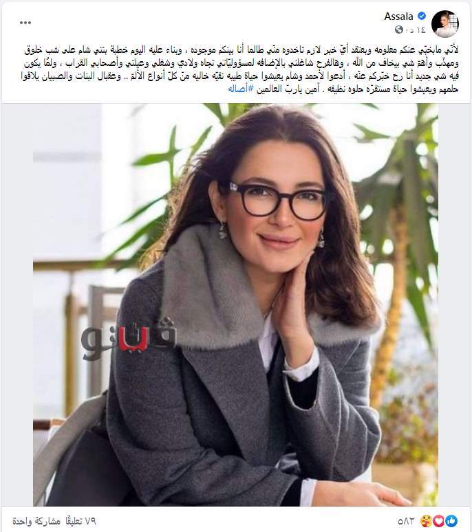 وتابعت أصالة :"هالفرح شاغلني بالإضافه لمسؤوليّاتي تجاه ولادي وشغلي وعيلتي وأصحابي القراب ، ولمًا يكون فيه شي جديد أنا رح خبّركم عنّه ، أدعوا لأحمد وشام يعيشوا حياة طيبه نقيّه خاليه منّ كلّ أنواع الألمّ .. وعقبال البنات والصبيان يلاقوا حلمهم ويعيشوا حياة مستقرّه حلوه نظيفه . آمين ياربّ العالمين #أصاله".