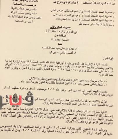 وقالت المحكمة أن وقائع الدعوى الماثلة تتلخص فيما جاء بتقرير لجنة الاقتراحات بإدارة التفتيش الفني علي الادارات القانونية بوزارة العدل من طلب إحالة جميع أعضاء الادارة القانونية بأكاديمية الفنون للتحقيق بشأن عدم حضورهم الي مقر عملهم يوم 3/6/2018 حتي الساعة الحادية عشر صباحاً.