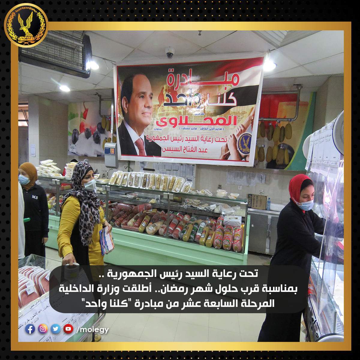جاء ذلك في أعقاب إطلاق وزارة الداخلية فعاليات المرحلة السابعة عشرة من مبادرة (كلنا واحد) اعتبارًا من يوم 15 مارس ولمدة شهر، بالتنسيق مع مختلف قطاعات الوزارة ومديريات الأمن على مستوى الجمهورية، لتوفير كافة مستلزمات ومتطلبات المواطنين من (سلع غذائية "إستراتيجية– أساسية"، سلع معمرة وأدوات منزلية– ملابس ومفروشات– مستلزمات طبية وقائية) بجودة عالية وأسعار مخفضة عن مثيلاتها بالأسواق تيسيراً على المواطنين، وذلك بعدد من فروع السلاسل التجارية الكبرى تصل إلى أكثر من 750 فرعا على مستوى الجمهورية.. وذلك بالتنسيق مع الإدارة العامة لشرطة التموين والتجارة والموردين من أصحاب الشركات التجارية المتخصصة فى تلك المجالات للمشاركة فى المبادرة.