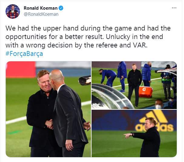 وكتب رونالد كومان تغريدة على تويتر: "كانت لنا اليد العليا خلال المباراة وأتيحت لنا الفرص لتحقيق نتيجة أفضل. لكن الحظ سيئ جاء في النهاية بقرار خاطئ من الحكم وحكم الفيديو المساعد"