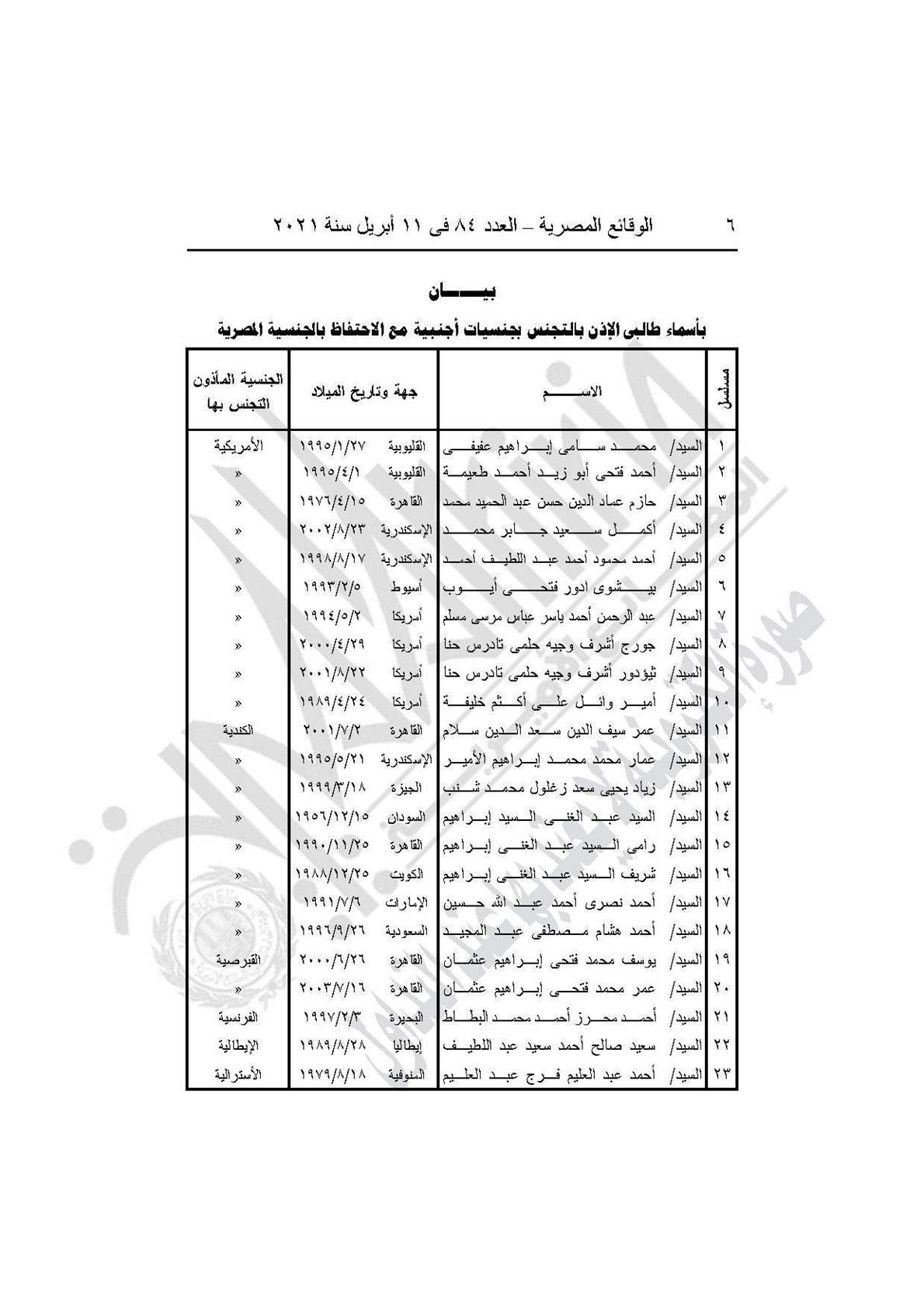 نشرت جريدة الوقائع المصرية في عددها رقم 84، الصادر في 11 أبريل 2021، قرار وزارة الداخلية رقم 411 لسنة 2021، بشأن الأذن لـ23 مواطنًا التجنس بالجنسية الأجنبية مع احتفاظهم بالجنسية المصرية.