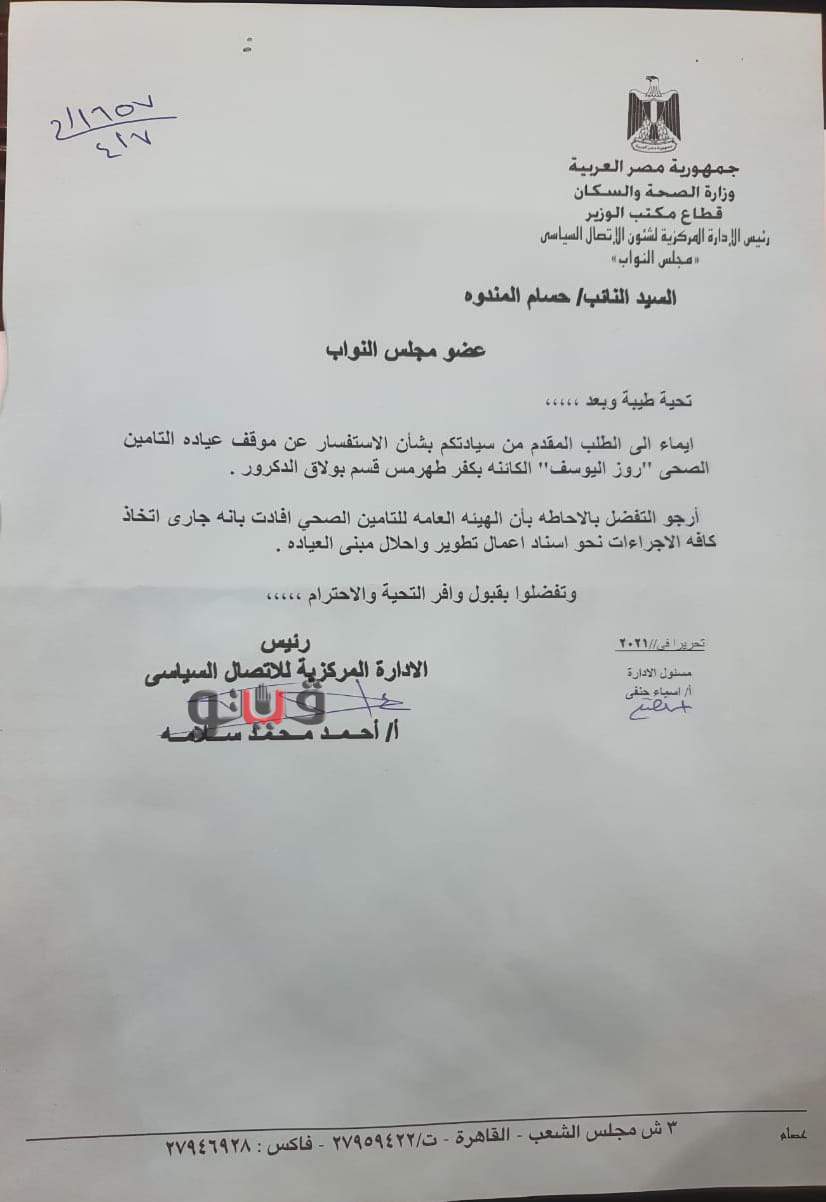 والسكان، للرد على انتقادات النائب بتعطل عيادة "روز اليوسف" للتأمين الصحى