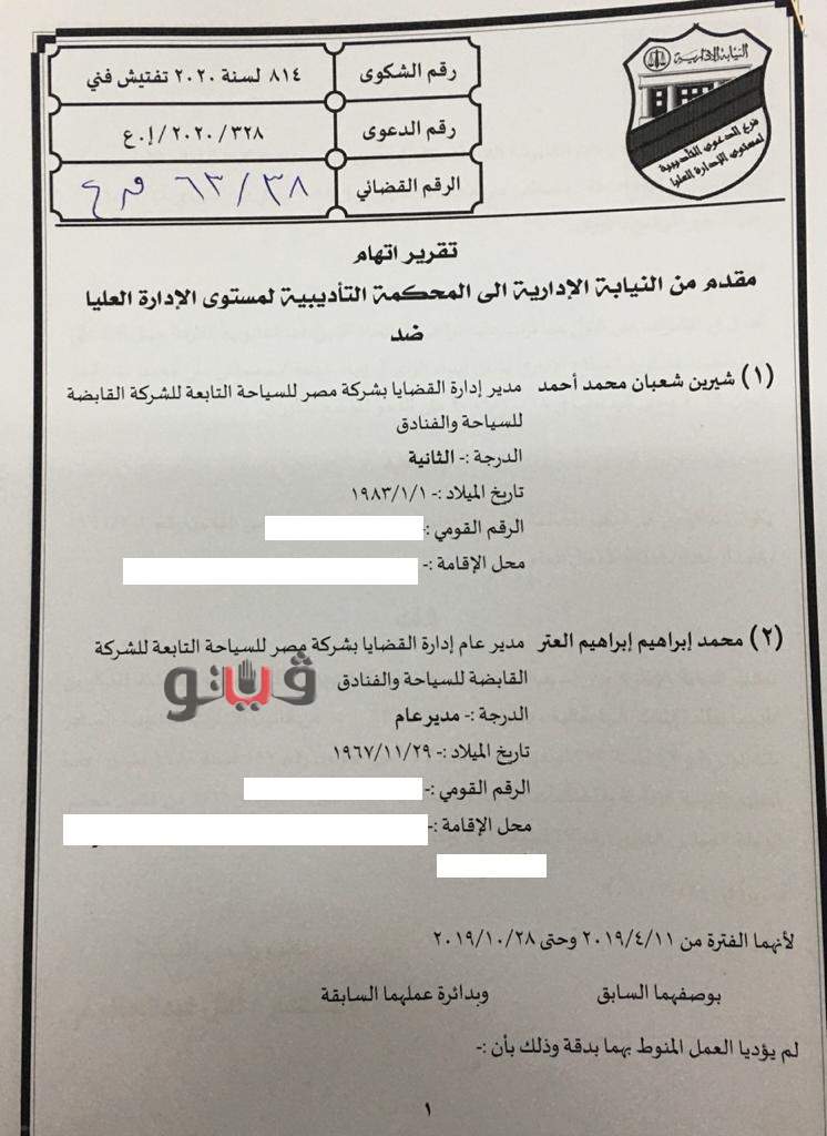 أحالت وزارة العدل في القضية رقم 38 لسنة 63 قضائية عليا، مسئولين بشركة مصر للسياحة "إحدى الشركات التابعة للشركة القابضة للسياحة والفنادق" للمحاكمة العاجلة بعد ثبوت إرتكابهما مخالفات إدارية وقانونية.