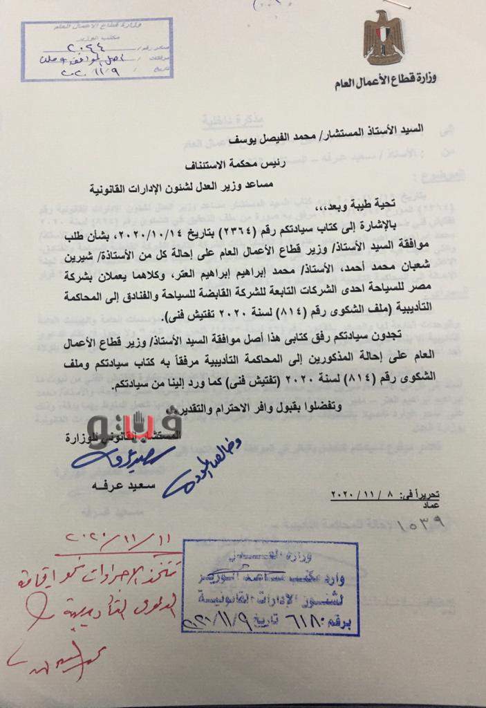 وأرفق مع مذكرة المستشار القانوني لوزارة قطاع الأعمال العام ملف الشكوى رقم 814 لسنة 2020 ومذكرة إدارة التفتيش الفني على الإدارات القانونية بوزارة العدل مؤشر عليه من الوزير بالموافقة على طلب مساعد وزير العدل بإحالة المذكورين للمحاكمة التأديبية
