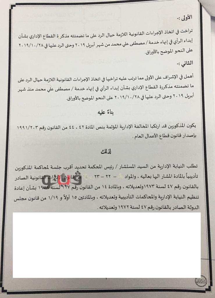 وتبين من أوراق تقرير الإتهام أن محمد إبراهيم العتر، مدير عام إدارة القضايا بالشركة أهمل في الإشراف على أعمال المحالة الأولى مما ترتب عليه تراخيها في اتخاذ الإجراءات القانونية اللازمة حيال الرد على ما تضمنته مذكرة القطاع الإداري من شهر إبريل وحتى الرد عليها في 28 اكتوبر 2019