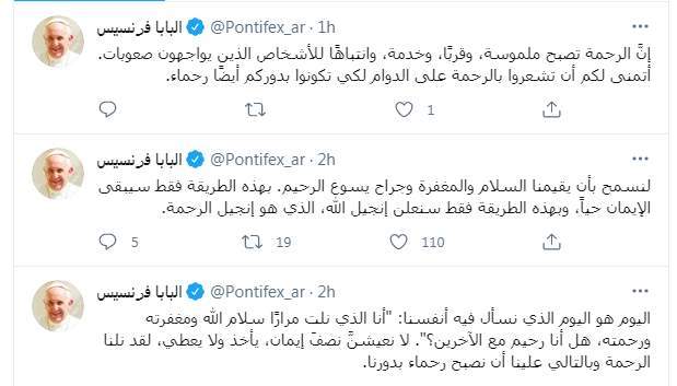 وكتب البابا فرنسيس تغريدة على تويتر "اليوم هو اليوم الذي نسأل فيه أنفسنا: "أنا الذي نلت مرارًا سلام الله ومغفرته ورحمته، هل أنا رحيم مع الآخرين؟". لا نعيشنَّ نصفَ إيمان، يأخذ ولا يعطي، لقد نلنا الرحمة وبالتالي علينا أن نصبح رحماء بدورنا"