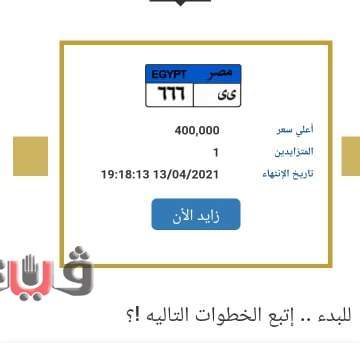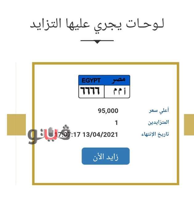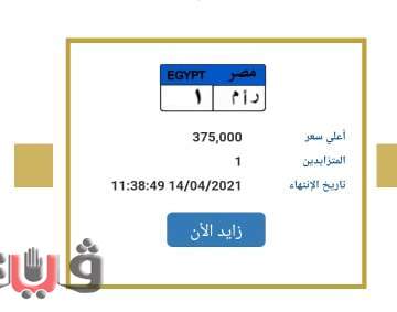 وتجرى المزايدة على لوحة "ر ب ى 111" بسعر 125 ألف جنيه، "ن أ" بـ 555 85 ألف جنيه، " ه ى م 555 " 95 ألف جنيه، " ر أ م 1"، 375 ألف جنيه، " ع ع ع 2" بقيمة 425 ألف جنيه، " ى ى 666" بقيمة 400 ألف جنيه، " ه ى م 555" بقيمة 95 ألف جنيه، " م و 2222" بقيمة 100 ألف جنيه، " أ م م 6666" بقيمة 95 ألف جنيه،