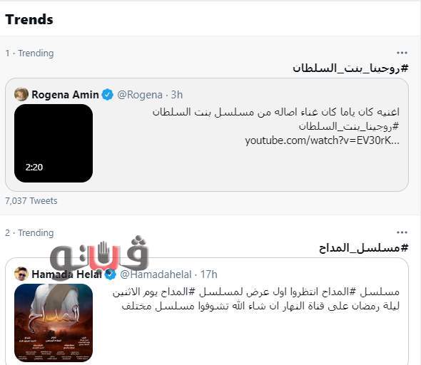 تصدرت الفنانة روجينا، والفنان حمادة هلال، تريند موقع التغريدات القصيرة “تويتر”، بهشتاج "روجينا بنت السلطان"، والمداح، وذلك قبل عرض مسلسليهما على قناة "النهار".