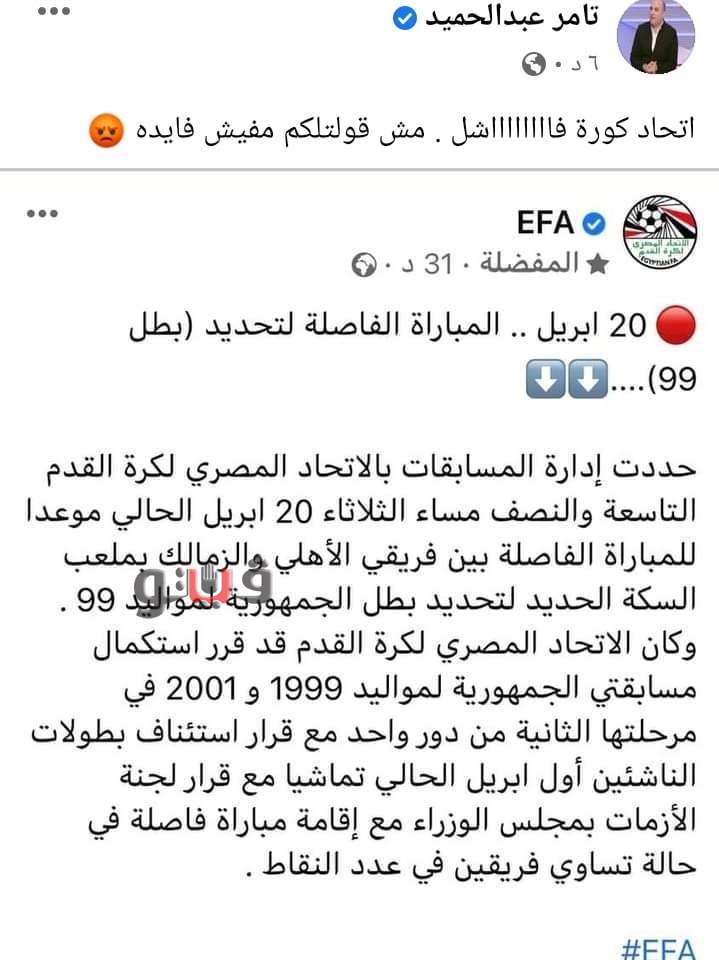 ونشر تامر عبد الحميد علي صفحته الرسمية فيس بوك صورة لقرار اتحاد الكرة لحسم البطل من خلال مباراة فاصلة.