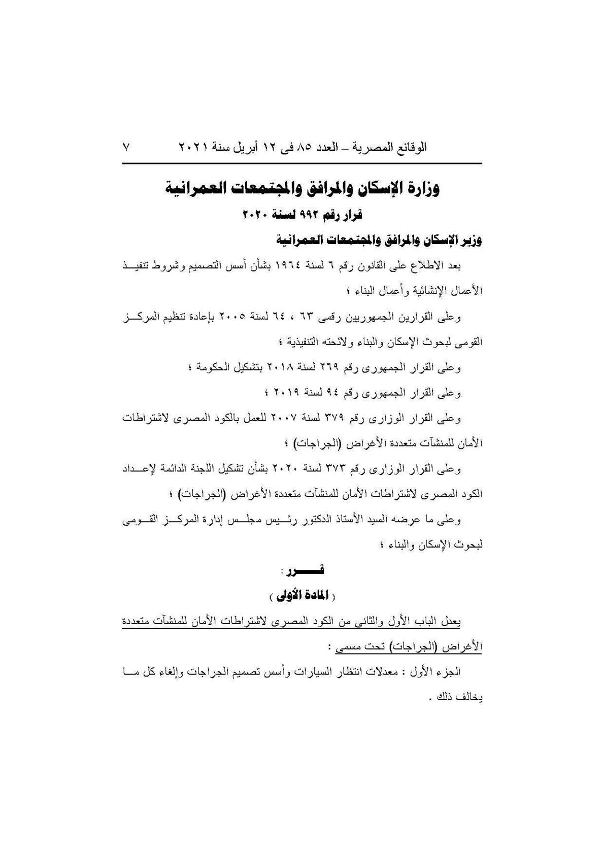 القرار الاول حمل رقم 992 لسنة 2020، بشأن تعديل الباب الأول والثانى من الكود المصرى لاشتراطات الأمان للمنشآت متعددة الأغراض (الجراجات) تحت مسمى : الجزء الأول : معدلات انتظار السيارات وأسس تصميم الجراجات وإلغاء كل ما يخالف ذلك.