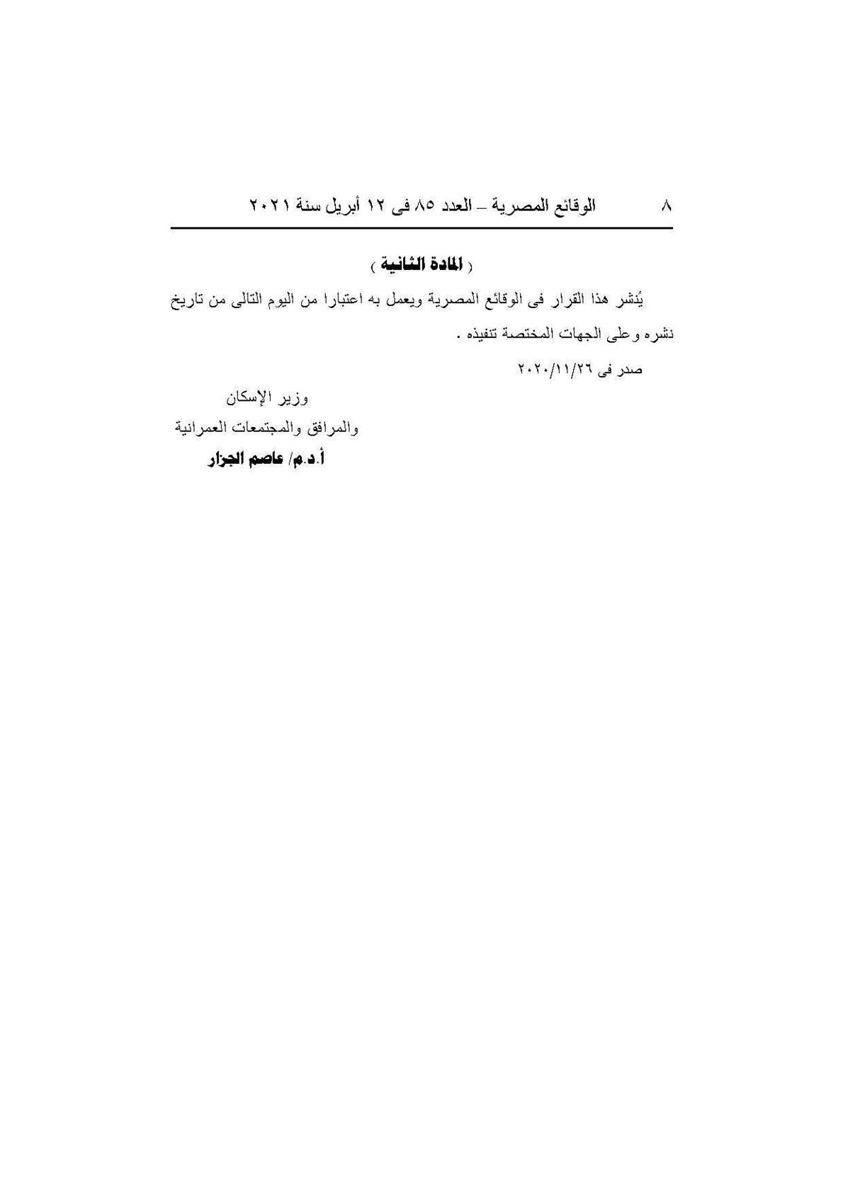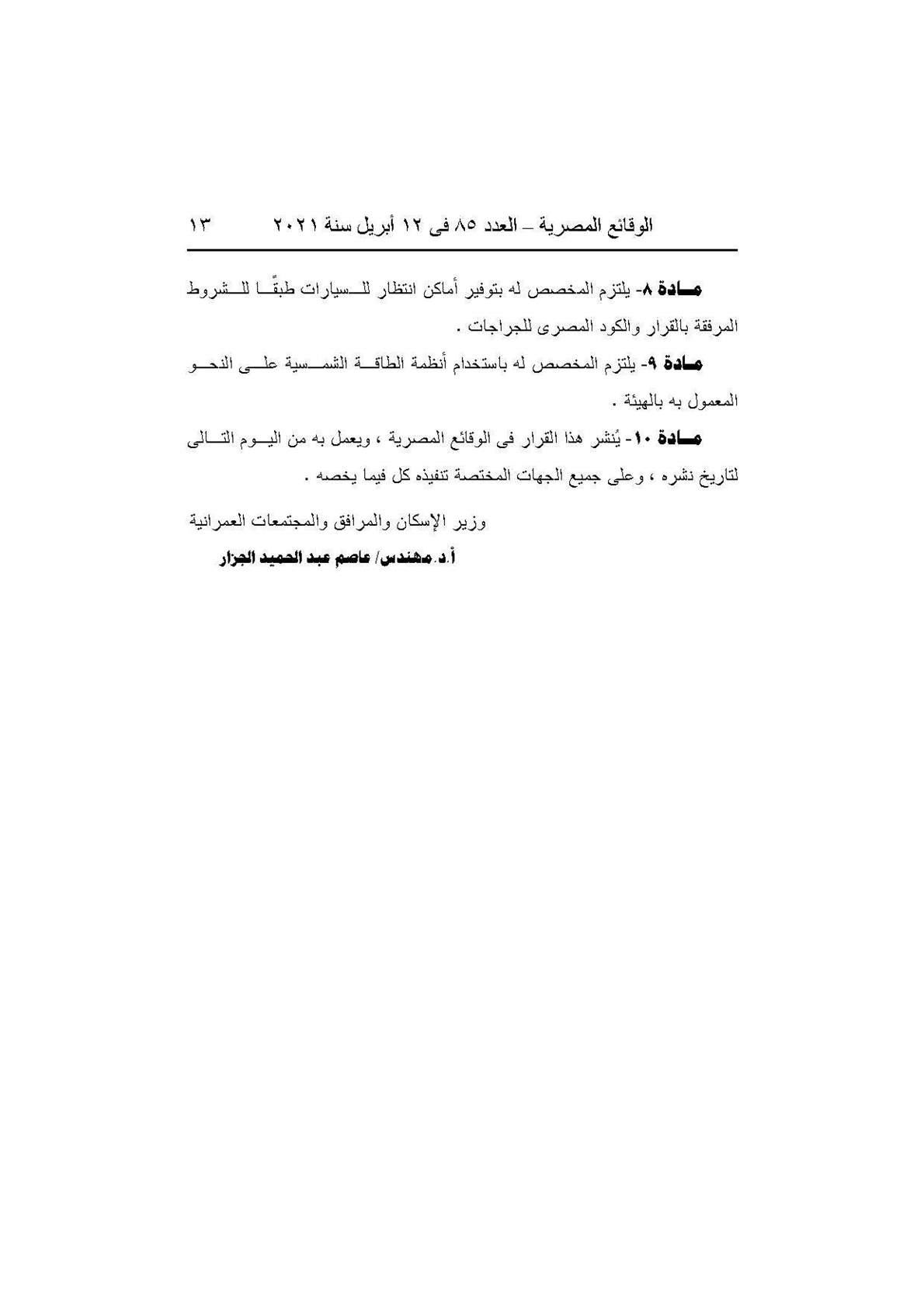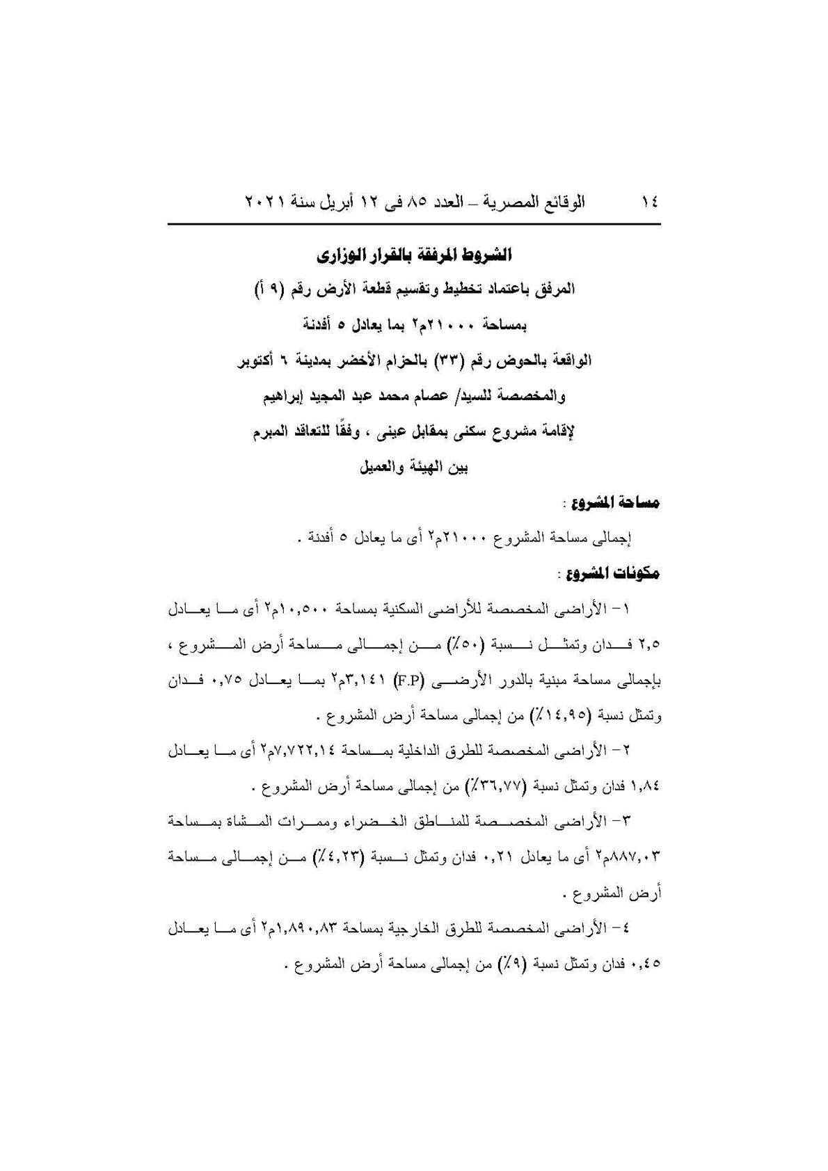 نشرت جريدة الوقائع المصرية في عددها رقم 85، الصادر في 12 أبريل 2021، قرارى وزارة الإسكان والمرافق والمجتمعات العمرانية بشأن تعديل الباب الأول والثانى من الكود المصرى لاشتراطات الأمان للمنشآت متعددة الأغراض، واعتماد تخطيط 5 أفدنة لإقامة مشروع سكنى بمقابل عينى في الحزام الأخضر بأكتوبر.