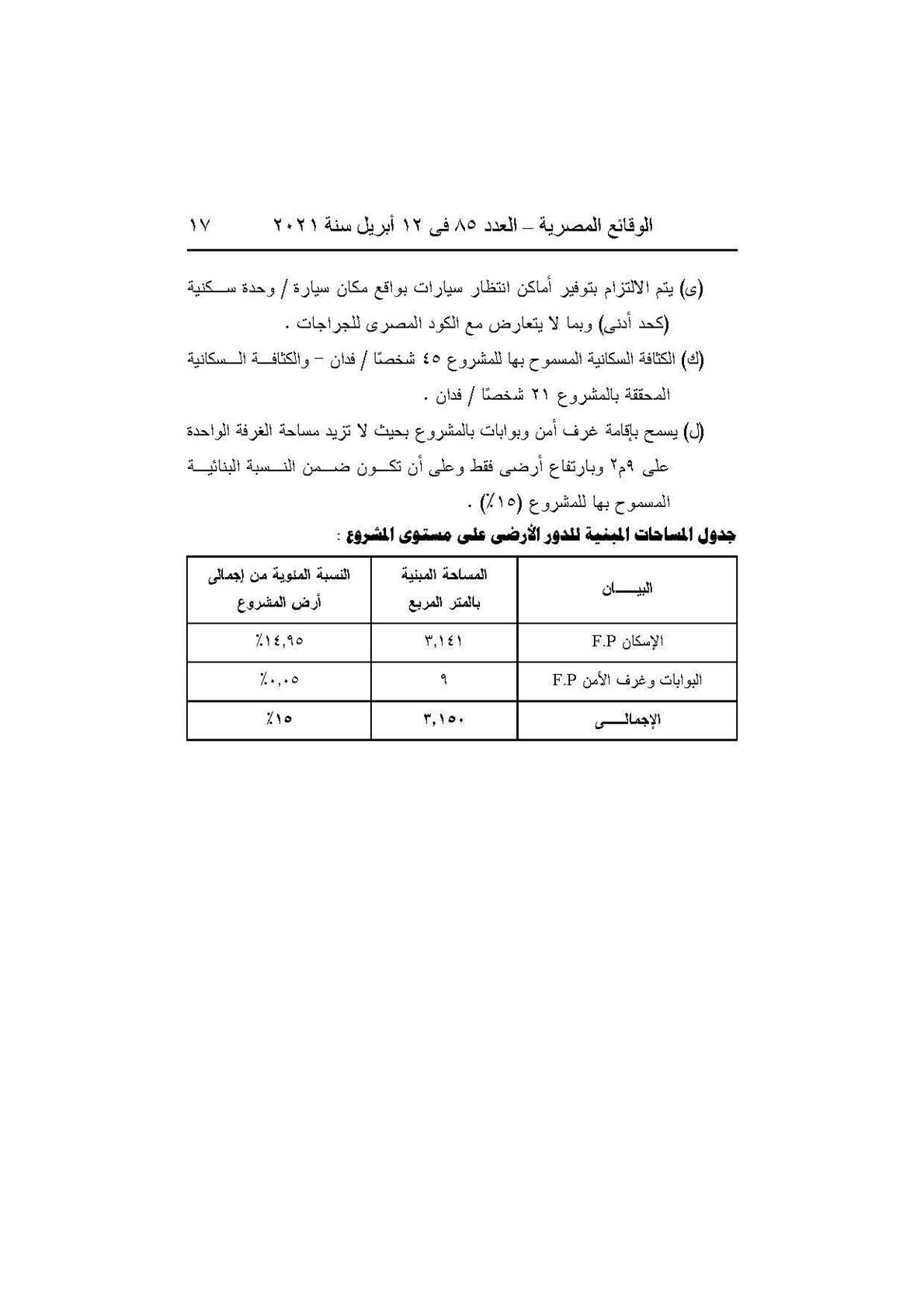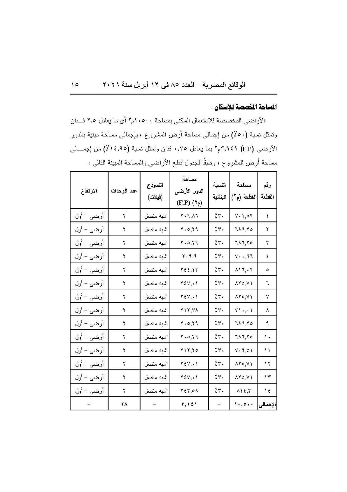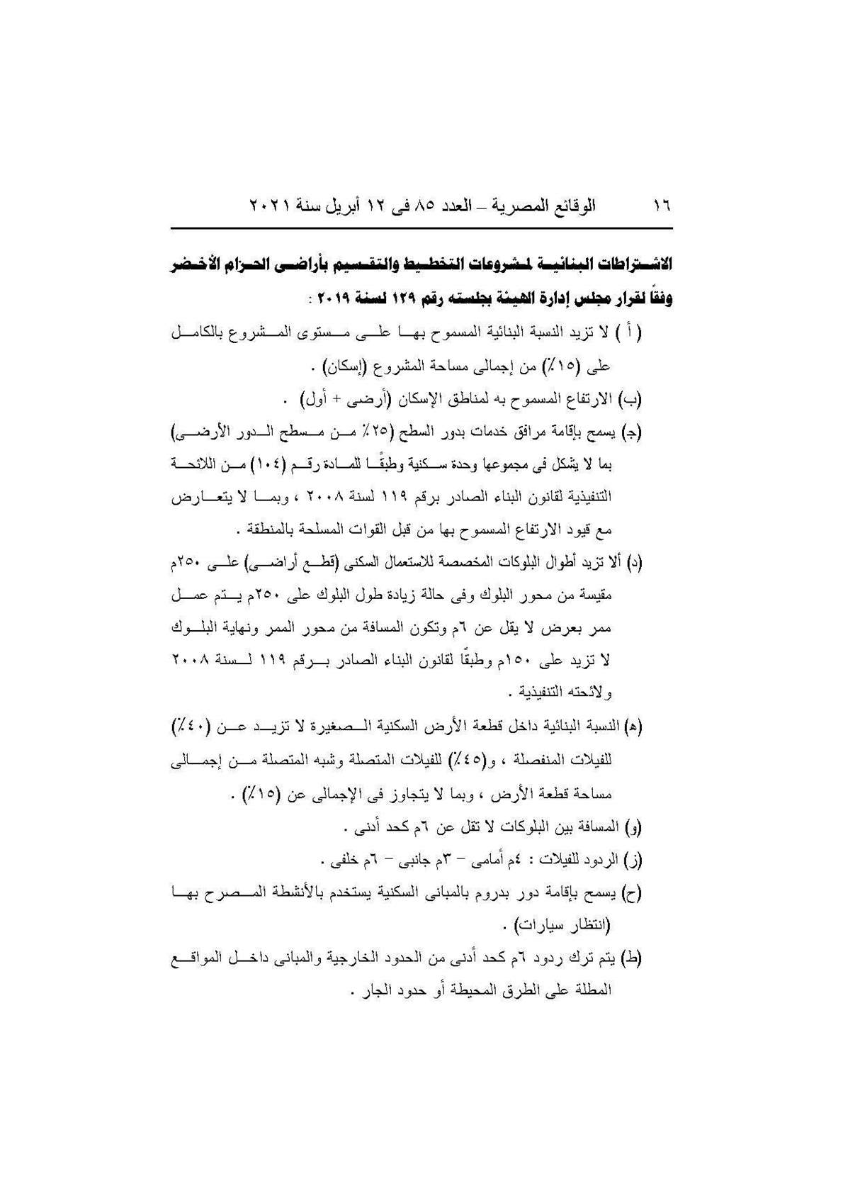 نشرت جريدة الوقائع المصرية في عددها رقم 85، الصادر في 12 أبريل 2021، قرارى وزارة الإسكان والمرافق والمجتمعات العمرانية بشأن تعديل الباب الأول والثانى من الكود المصرى لاشتراطات الأمان للمنشآت متعددة الأغراض، واعتماد تخطيط 5 أفدنة لإقامة مشروع سكنى بمقابل عينى في الحزام الأخضر بأكتوبر.