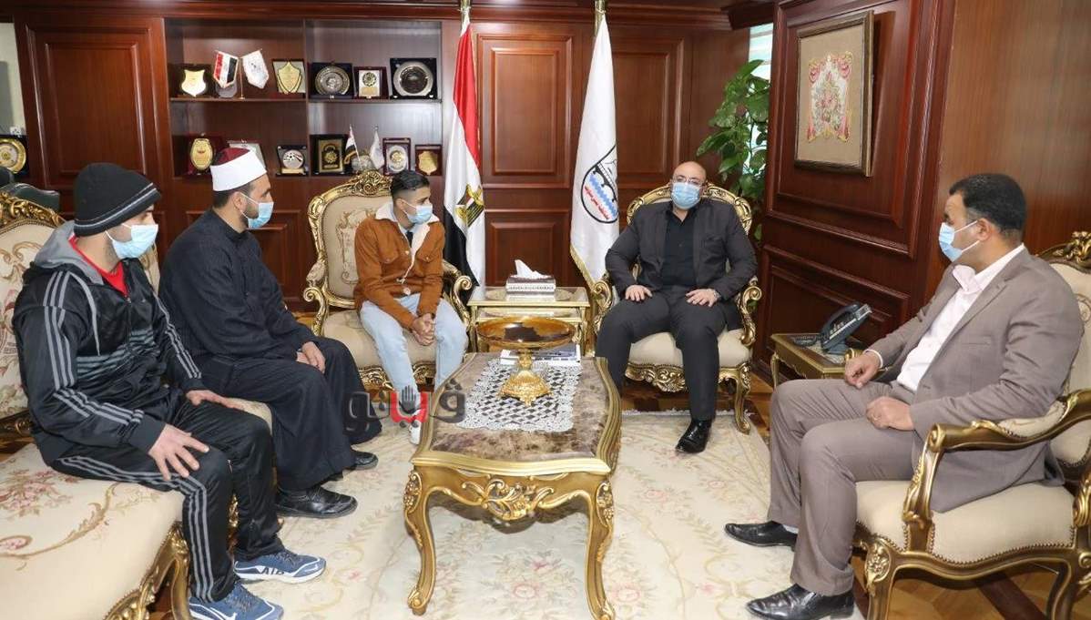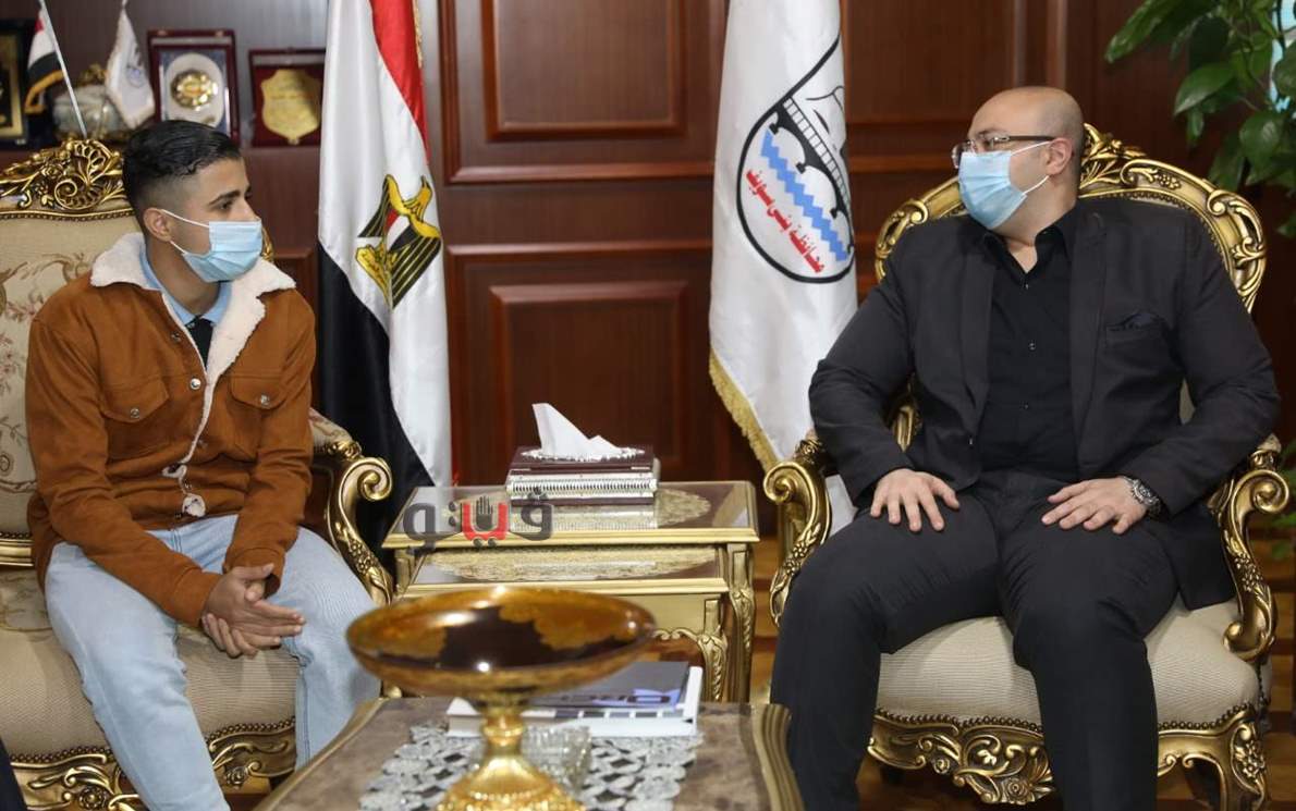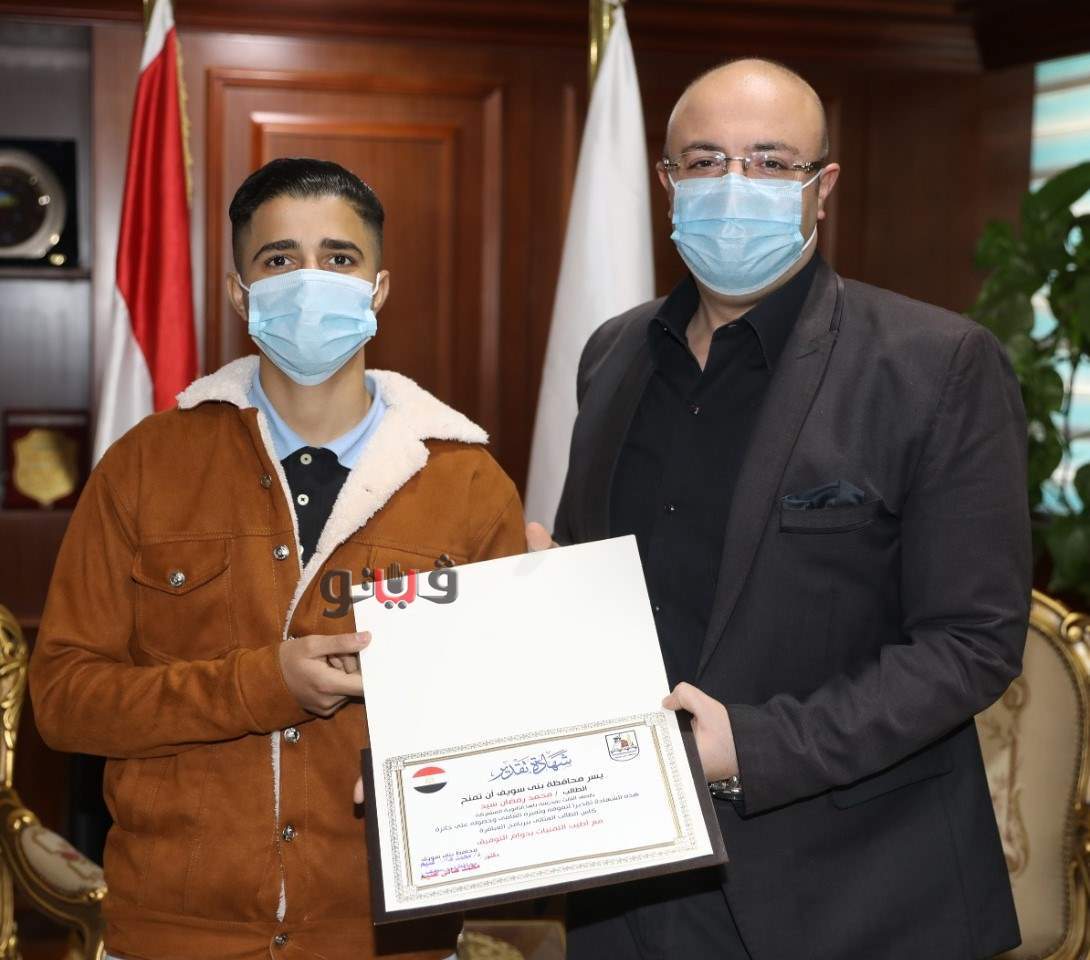 الدكتور محمد هاني غنيم محافظ بني سويف، اليوم الاثنين، الطالب "محمد رمضان سيد"